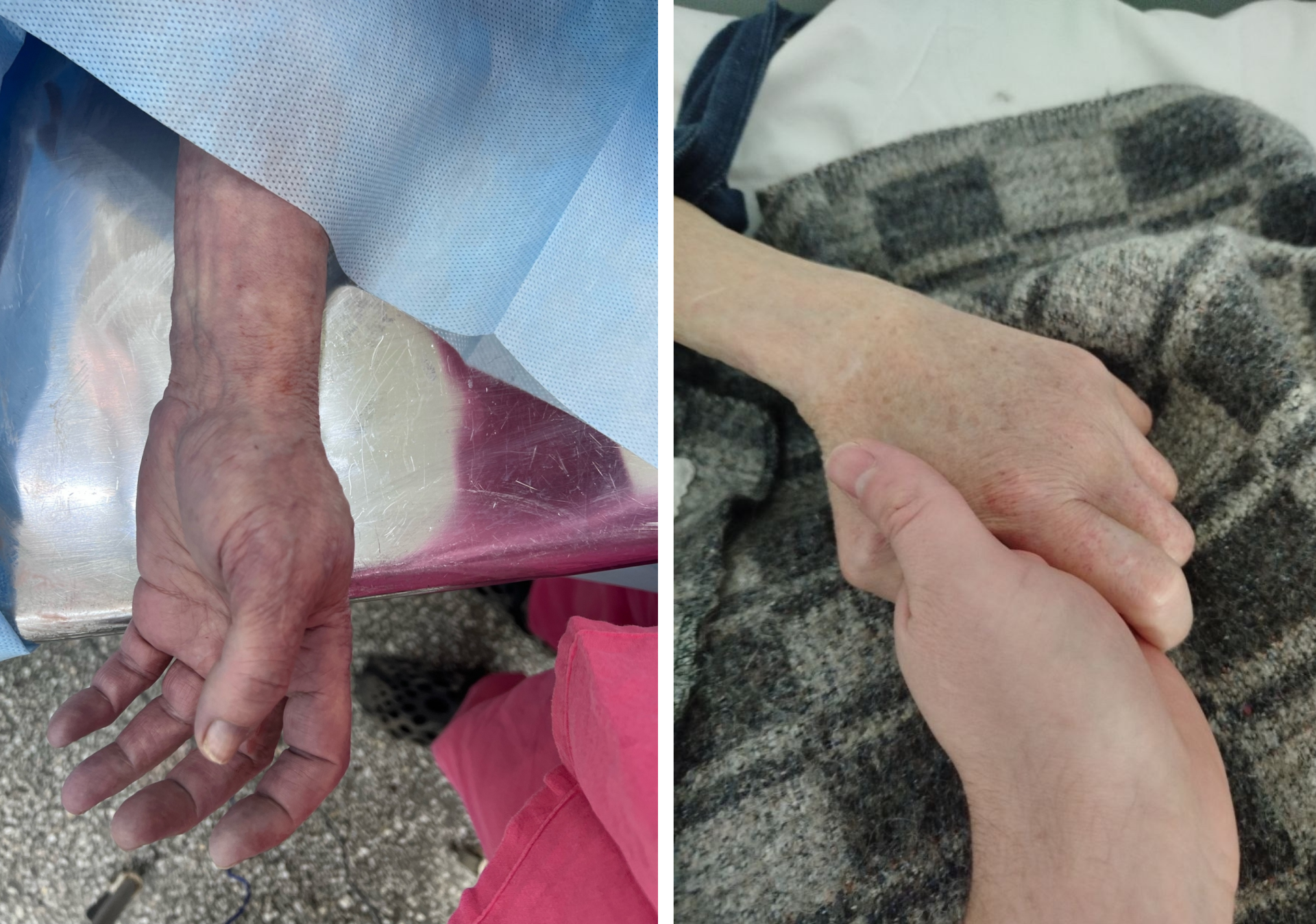В ходе тромбэктомии – операции по удалению тромбов – врачи через небольшие доступы в области руки и паха при помощи специального катетера удалили тромбы из артерий верхней и обеих нижних конечностей. После вмешательства кровоток удалось полностью восстановить.