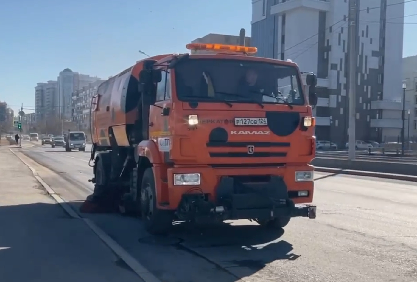В город пришла весна и на дороги краевой столицы вышли «Фанты» — большие моющие пылесосы. Дорожники выпускают эти подметально-уборочные машины, только когда сходит снег, а за окном становится стабильно тепло. Их задача — удалять пыль и мусор с проезжей части.