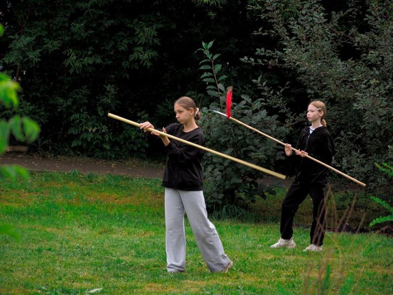 Рядом шли мастер-классы по ушу. Хрупкие девочки София Михель и Екатерина Албитова со свистом рассекали воздух мечами и палками, так они отрабатывали приёмы восточной борьбы. К открытой тренировке присоединялись гости праздника.