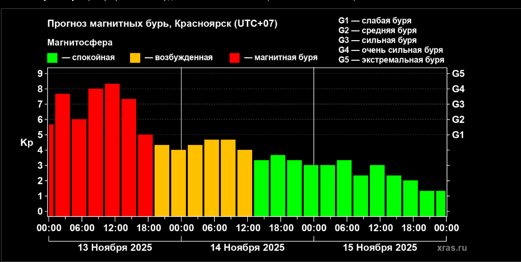 Сегодня, 12 ноября, ученые Лаборатории солнечной астрономии ИКИ и ИСЭФ вновь фиксируют повышенную магнитную активность. По данным сайта, днем буря достигнет 8 баллов из 9 возможных и пойдет на спад только к вечеру. Завтра, 14 ноября, магнитосфера будет спокойной.