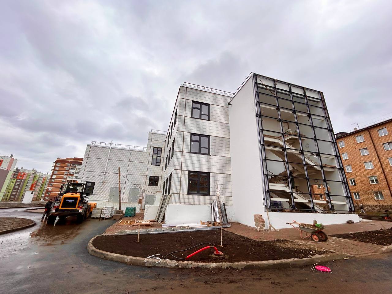 В здании полным ходом идёт чистовая отделка. Как только работы будут закончены, сюда привезут мебель. Также строители монтируют витражи.