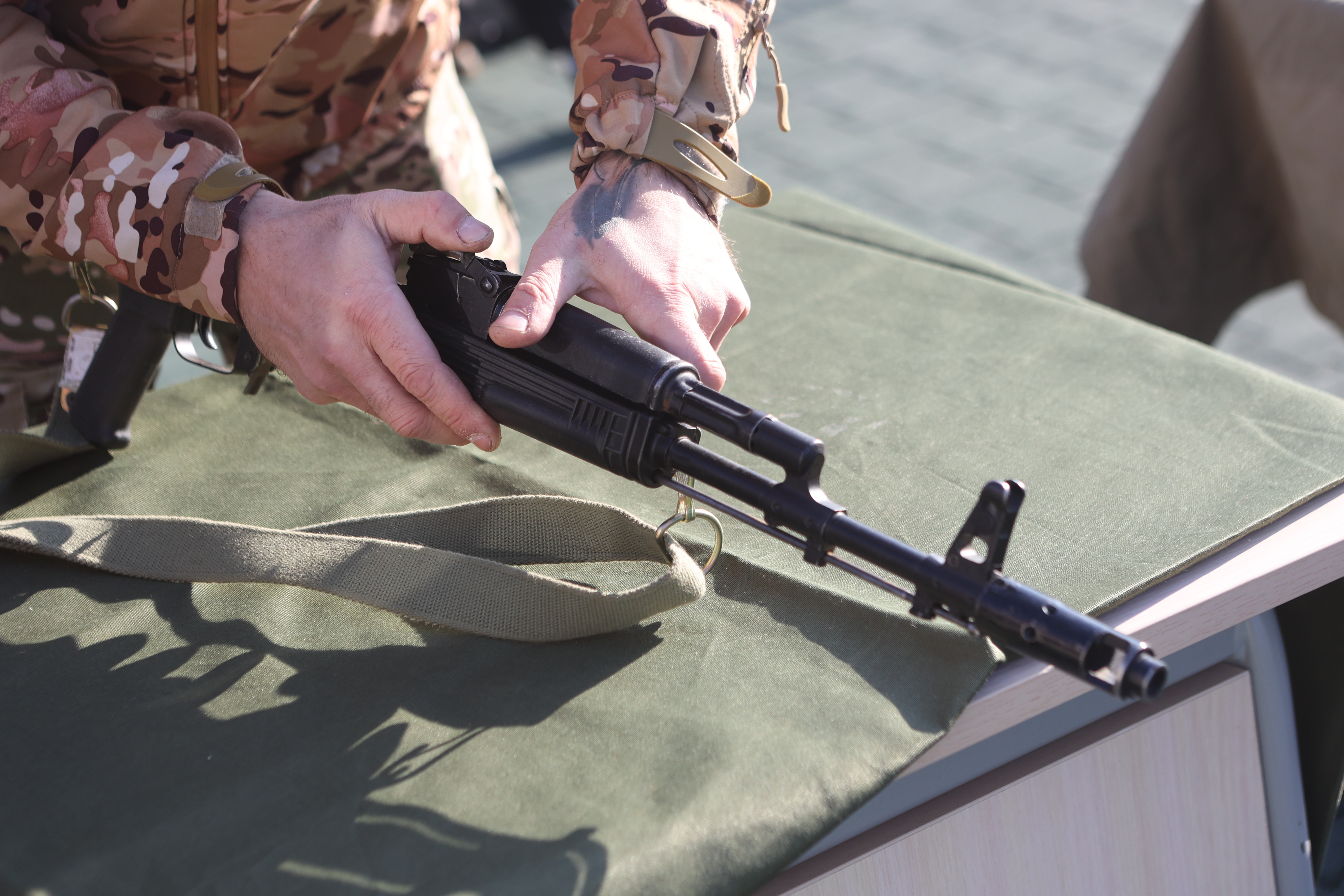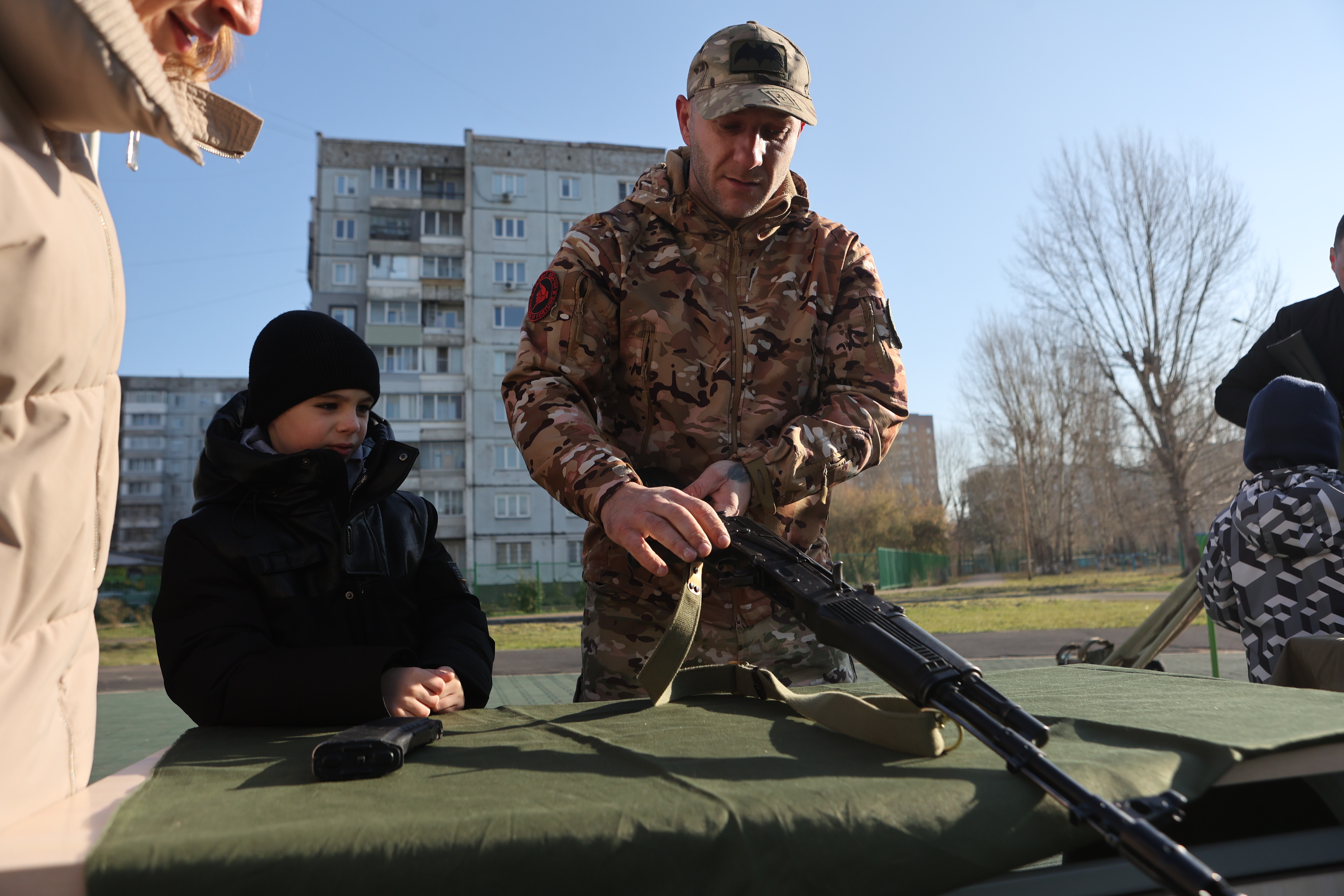 А второе направление деятельности бойца с позывным Пума — воспитание молодёжи. Для этого он даже специально прошёл курсы тактической медицины — чтобы передавать нужные знания подрастающему поколению. И встретились мы с ним как раз на площадке патриотического праздника. Там наш герой учил первоклассников и их родителей правильно разбирать-собирать автомат, а также делился навыками оказания неотложной помощи.