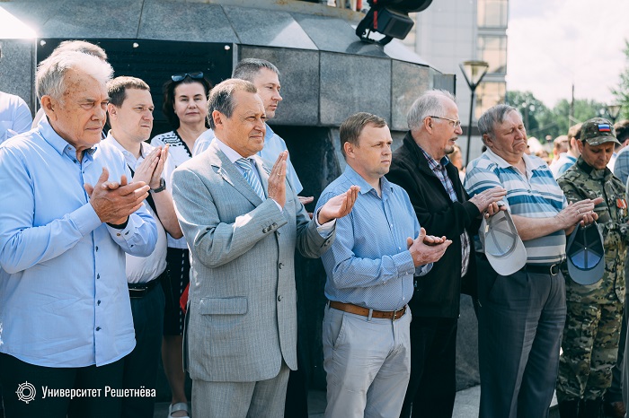 Ректор поблагодарил коллективы предприятий и организаций, усилиями и участием которых была реализована инициатива установки на бетонный постамент флагштока с флагом страны, в том числе компанию ООО «Вариант-999» и ее директора С.И. Синникова, ООО «Отдел-строй» и руководителя Э.Т. Саргсян, коллектив инженерно-строительного института СФУ под руководством Р.А. Назирова, главу администрации Ленинского района Д.Л. Гурьева, специалистов лабораторий Центра трансфера технологий Университета Решетнёва и лично М.В. Сапова и, конечно, коллектив института лесных технологий под руководством С.Г. Елисеева с участием Е.В. Авдеевой, немало потрудившихся для зеленого благоустройства территории площади.