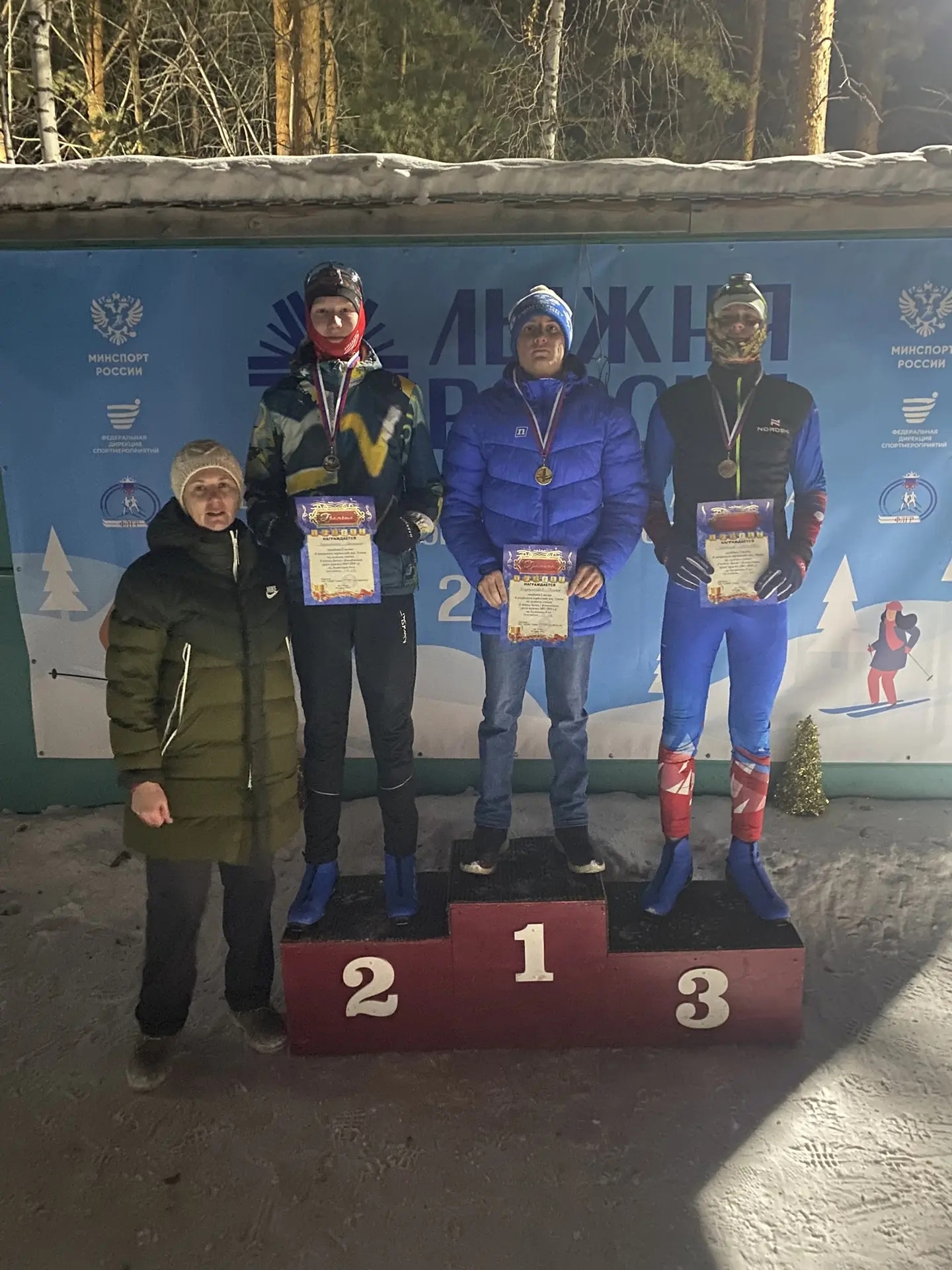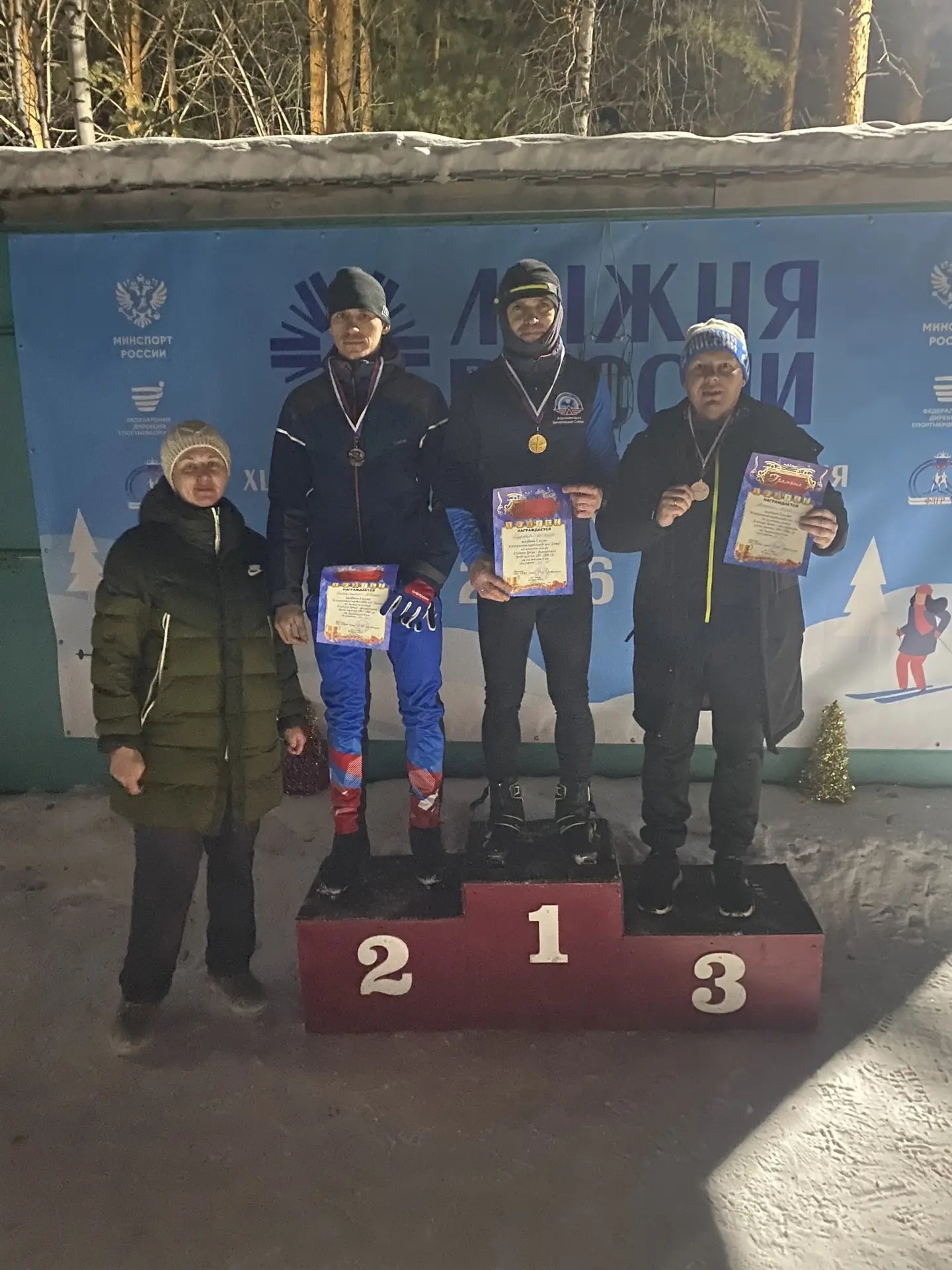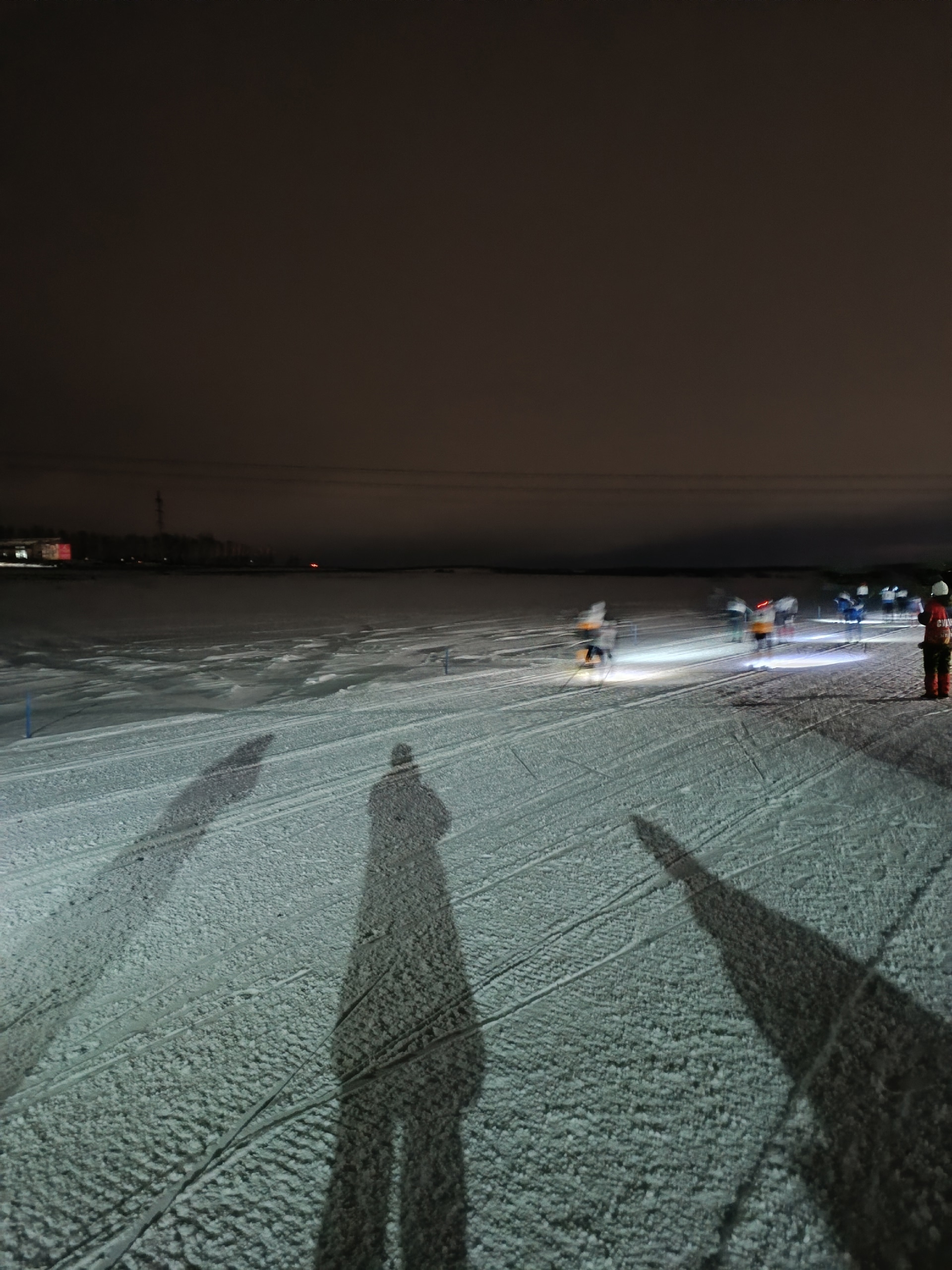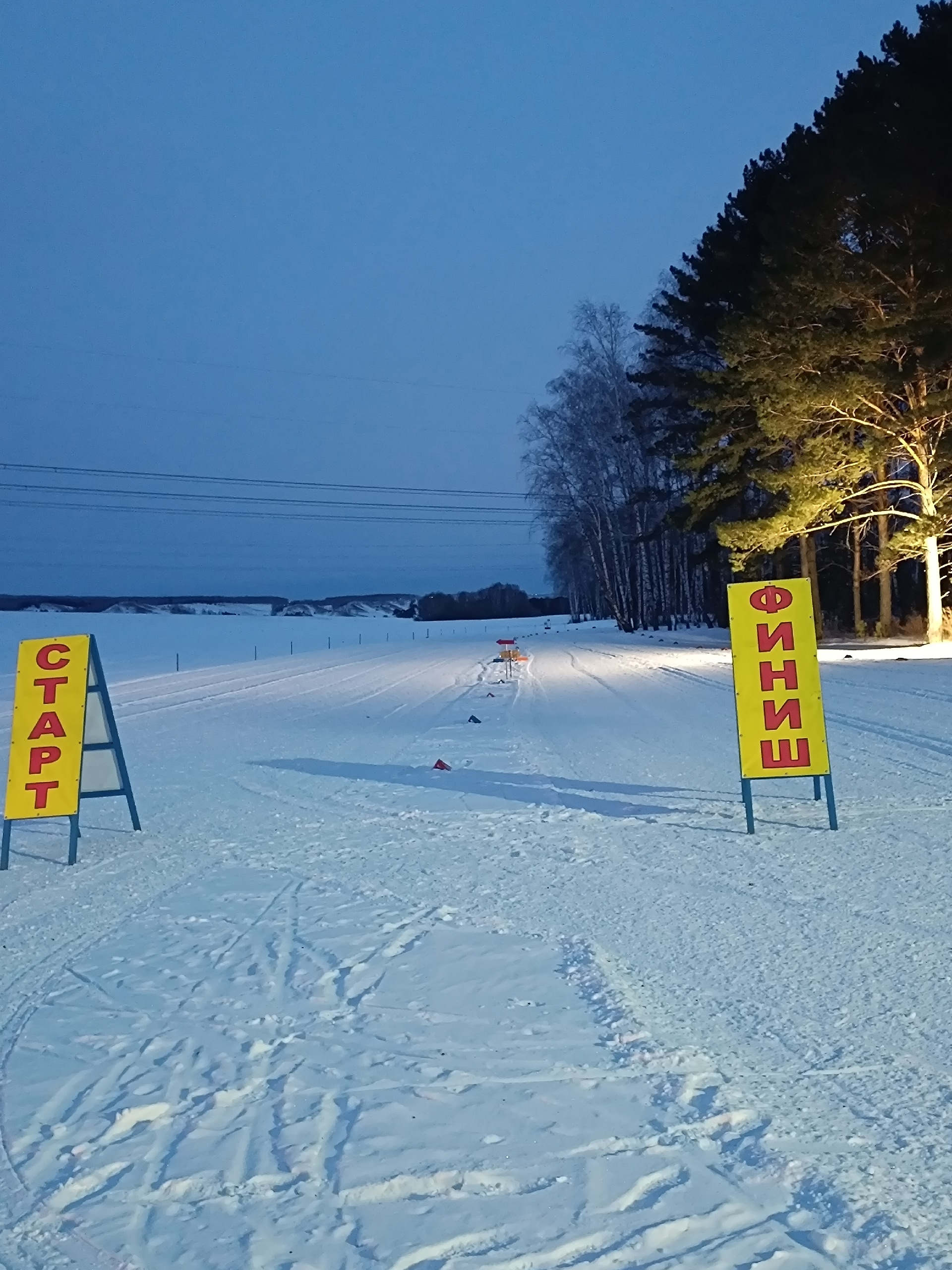 Участники пробежали дистанцию при свете фонарей по искрящемуся снегу.
