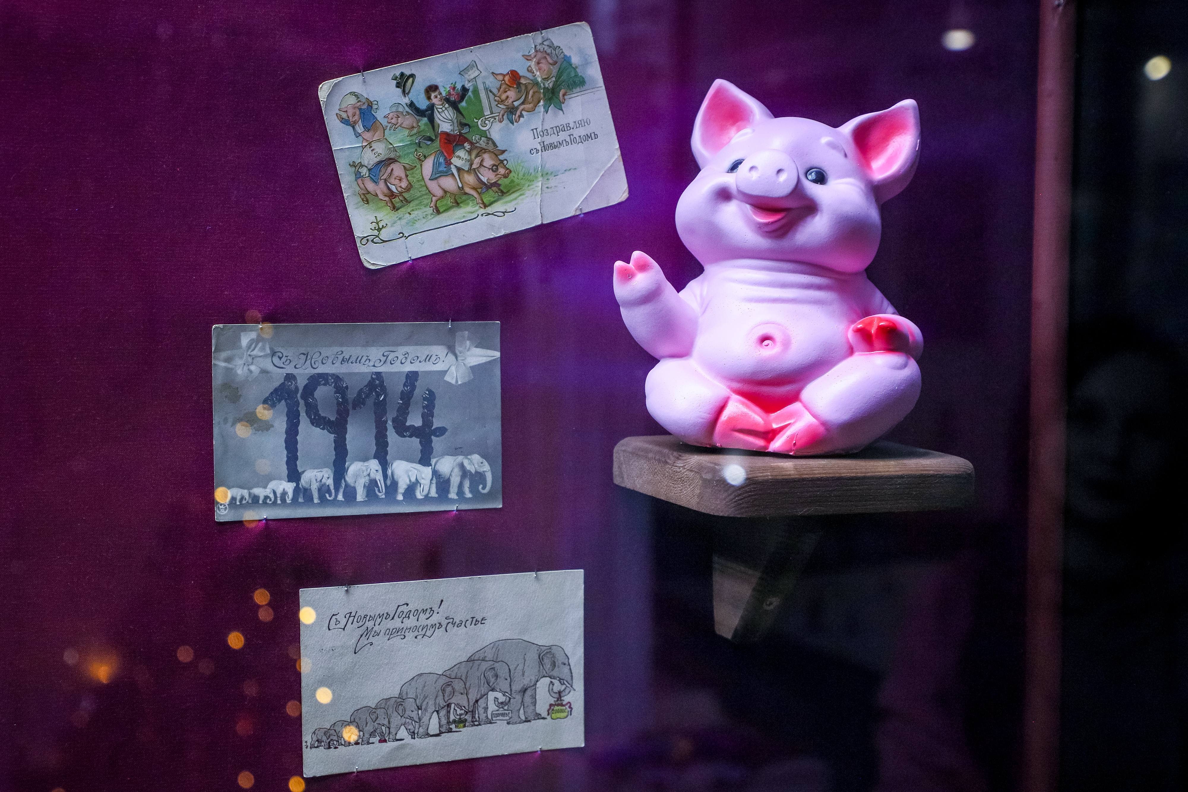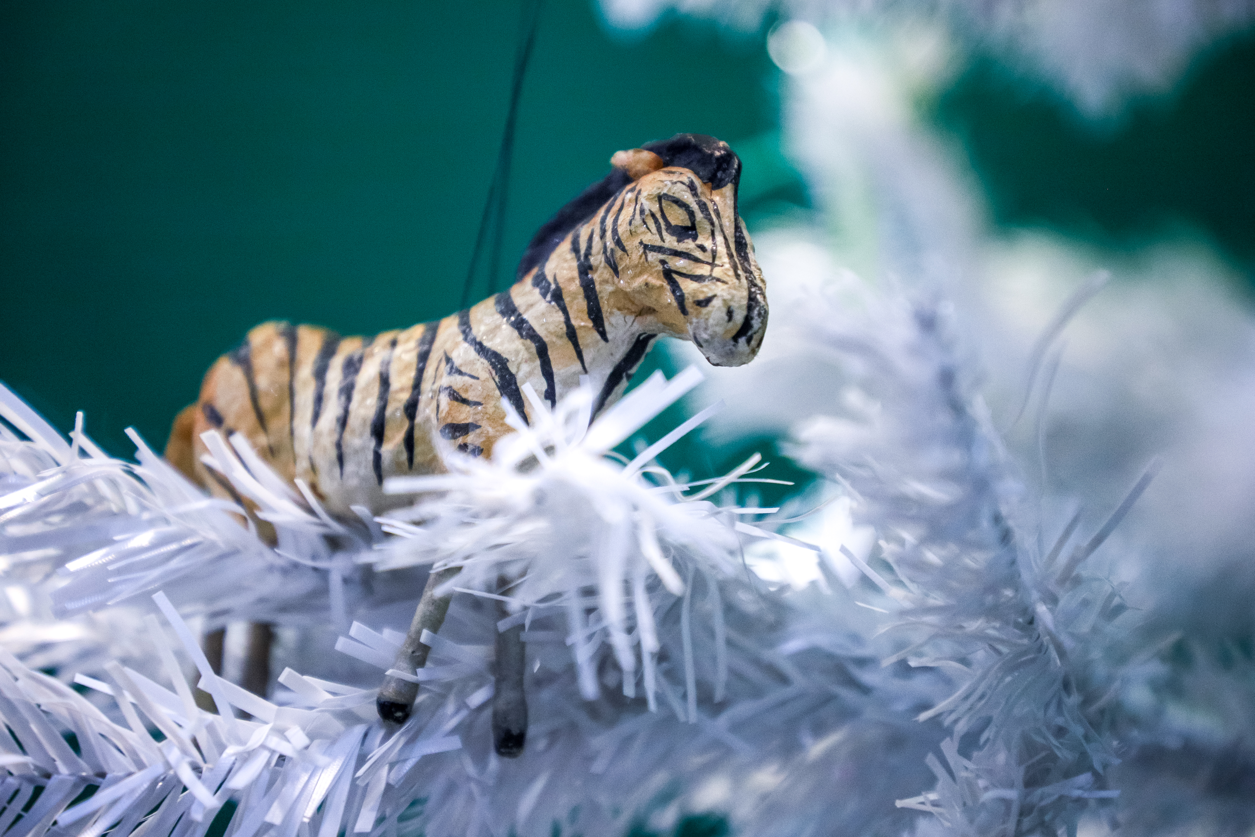 Третья часть выставки посвящена современному отношению к животным в новогодние праздники и показывает, как мы совмещаем влияние тех традиций, которые появлялись сотни лет назад. Самый наглядный пример — ёлка, украшенная самыми разными фигурками.