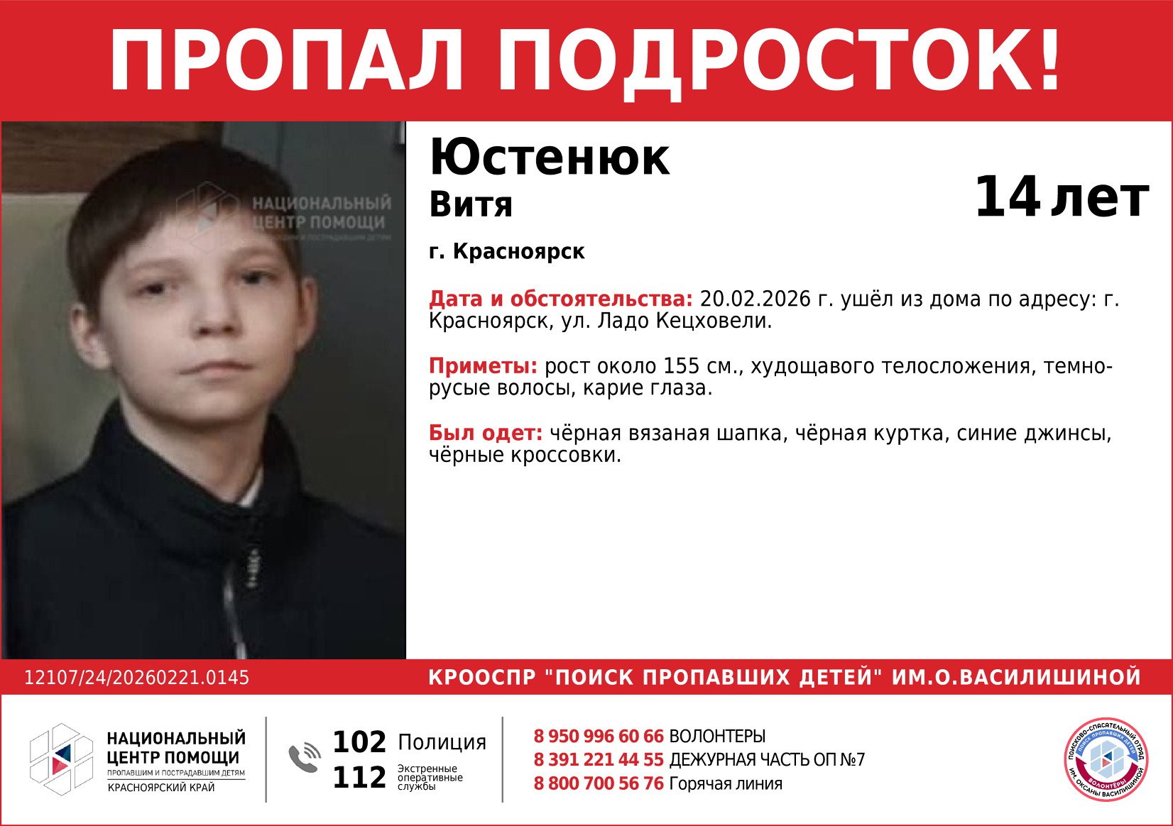 Полиция и волонтёры ведут поиски 14-летнего мальчика. Накануне, 20 февраля, он ушёл из дома с улицы Ладо Кецховели, и до сих пор неизвестно, где он находится.