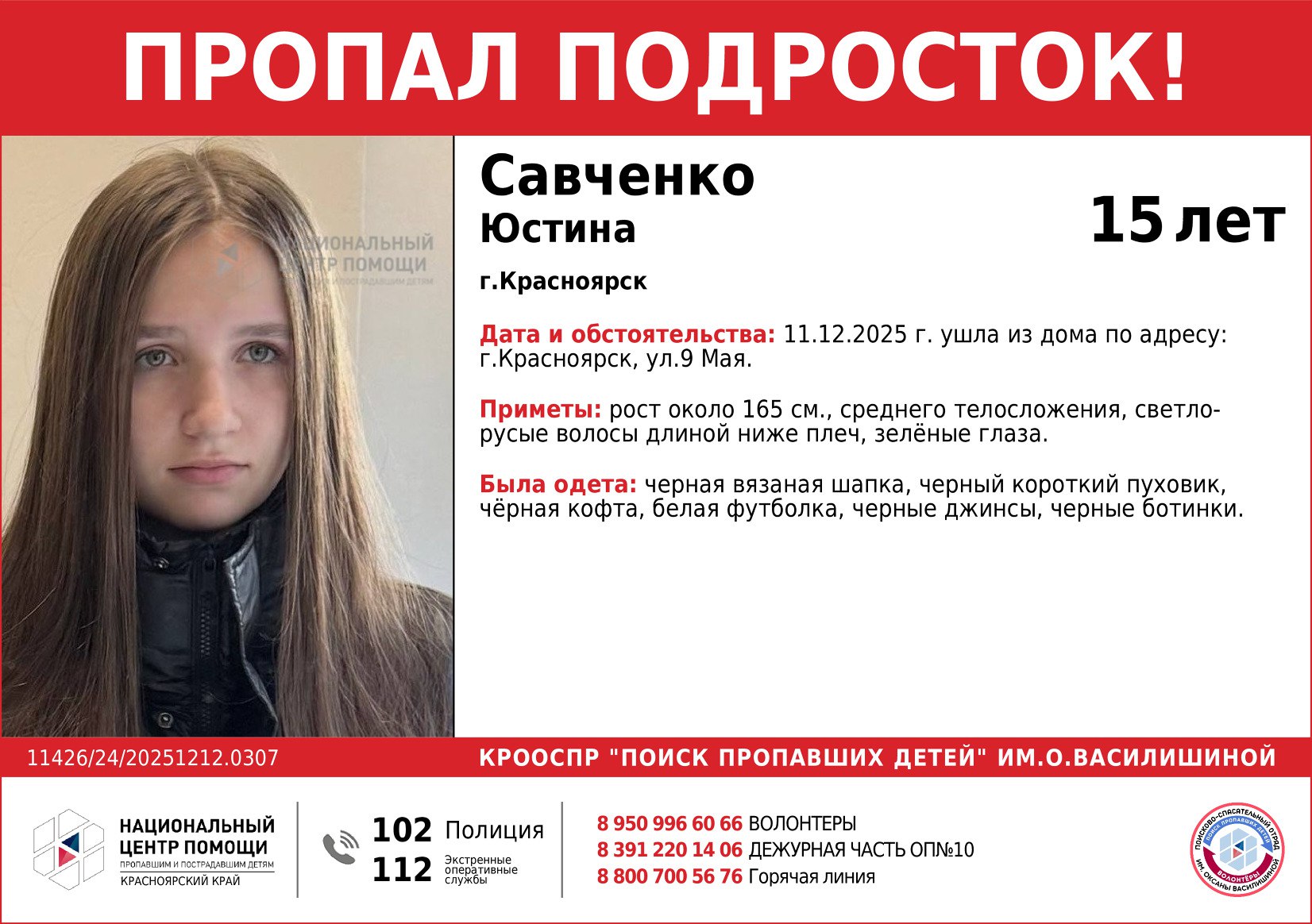 В Красноярске пропала 15-летняя Юстина Савиченко. Девочка ушла из дома вчера, 11 декабря  2025 года.