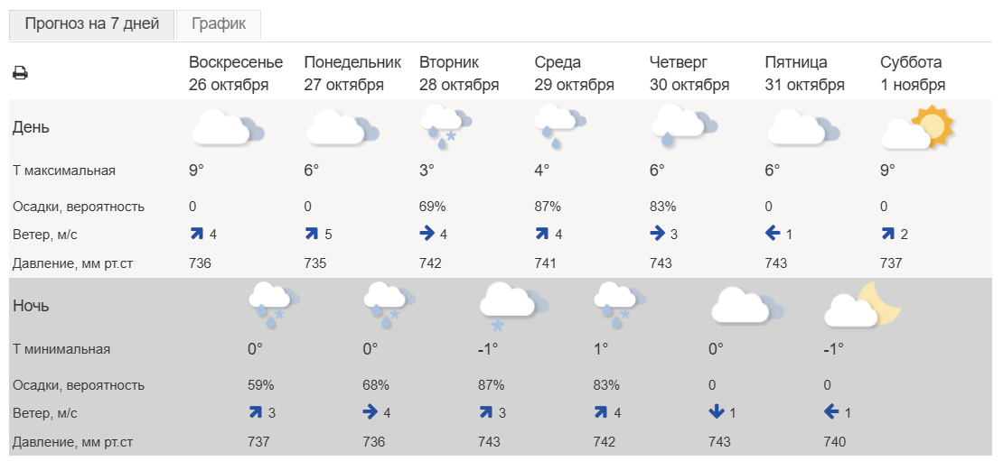 В среду и четверг — дождь, от 4 до 6 градусов тепла днём, +1...0 вечером.