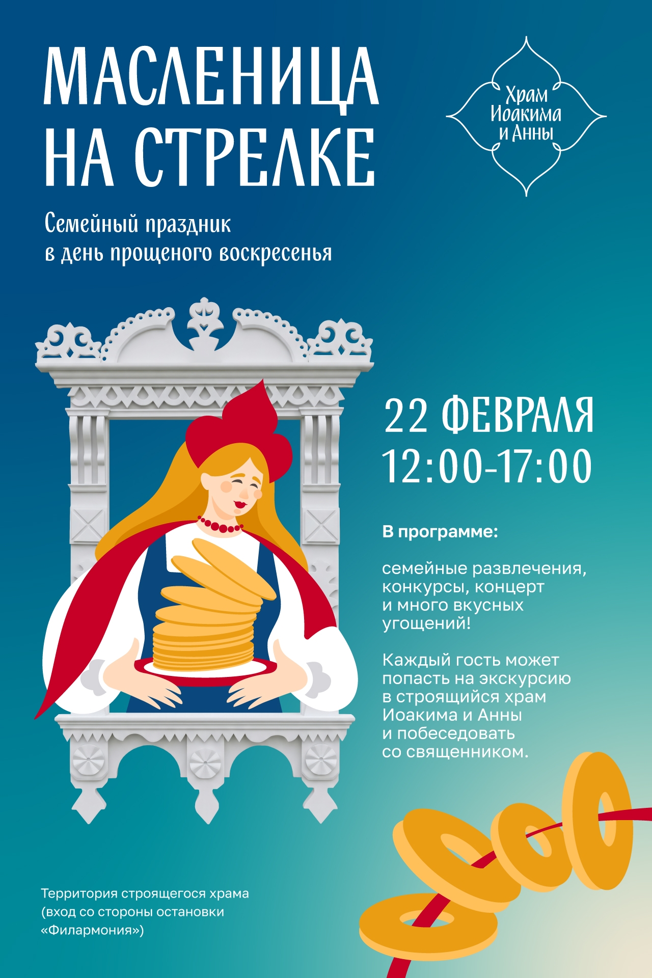 С 12:00 до 17:00 гостей ждут масленичные угощения, народные игры, интерактивные зоны и спортивные состязания. Одним из главных событий станет уникальная возможность зайти внутрь строящегося храма с экскурсией.