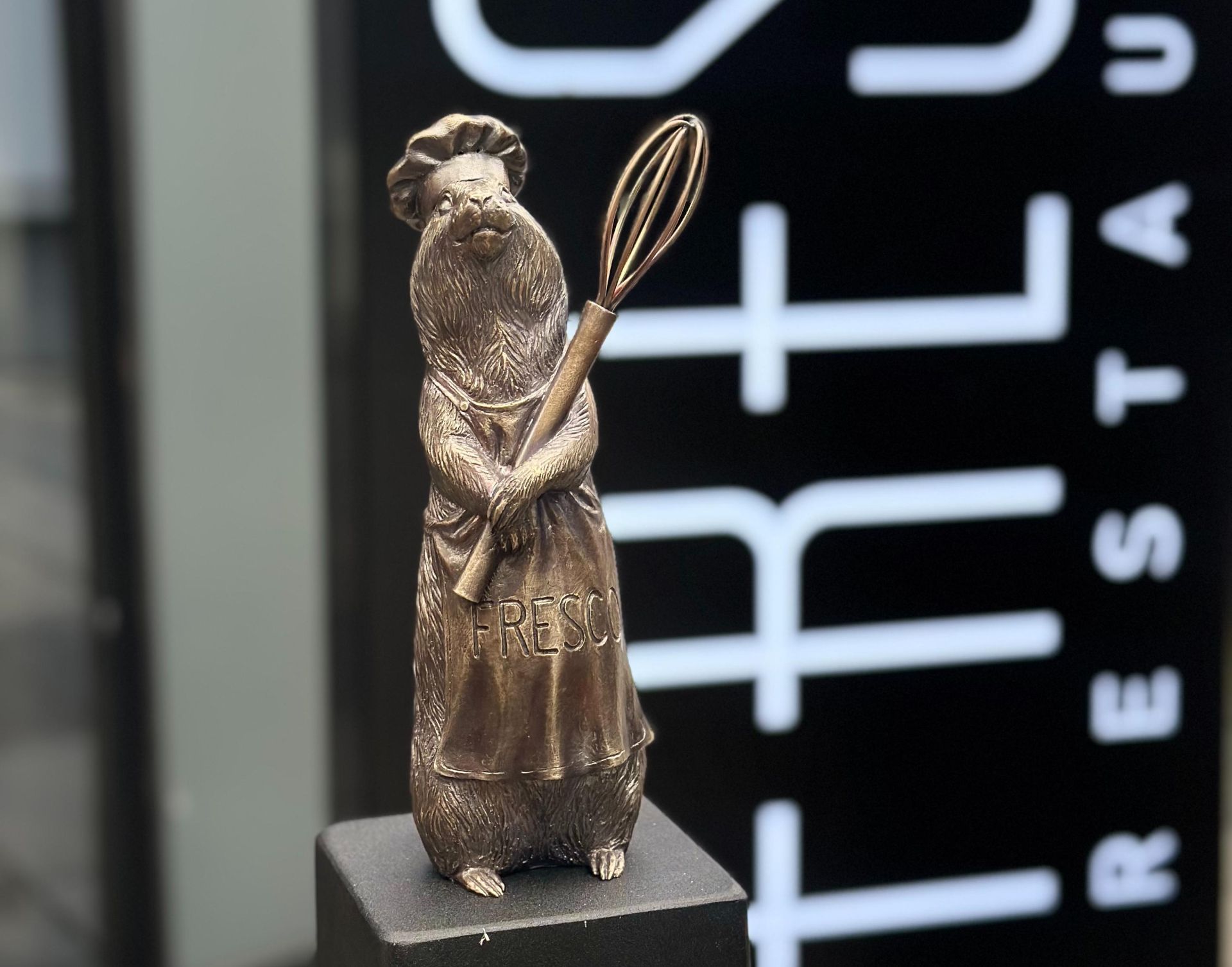Новый бронзовый суслик — повар по имени Веня. Он надел фартук и поварской колпак, а в лапах держит венчик — явно готовит что-то вкусное.