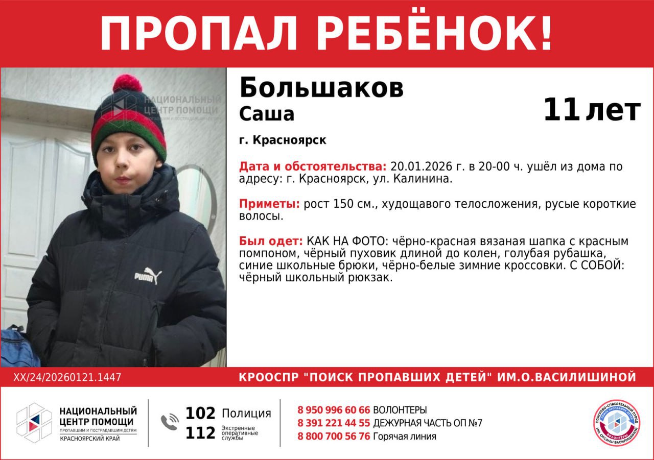В Красноярске продолжаются поиски 11-летнего мальчика, который ушел из дома вечером 20 января и до сих пор не вернулся. По данным волонтеров «Поиска пропавших детей» имени Оксаны Василишиной, школьник вышел из дома на улице Калинина около 20:00. С этого момента его местонахождение неизвестно.