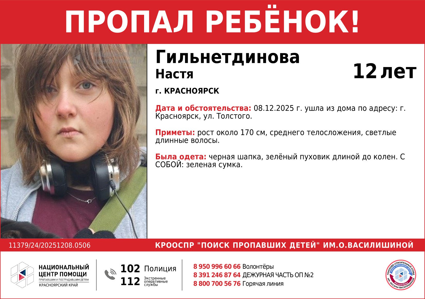 В Красноярске пропала 12-летняя девочка. Сегодня, 8 декабря, она ушла из дома на улице Толстого, и теперь ее местонахождение неизвестно. Приметы: рост около 170 см, светлые длинные волосы, среднее телосложение.