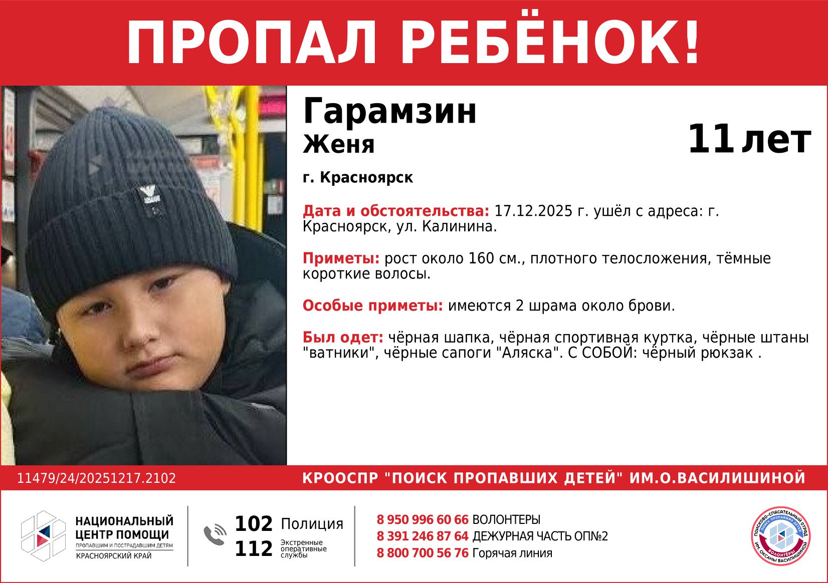 В Красноярске пропал ребенок. Накануне, 17 декабря, 11-летний мальчик ушел из дома на улице Калинина и до сих пор не вышел на связь.