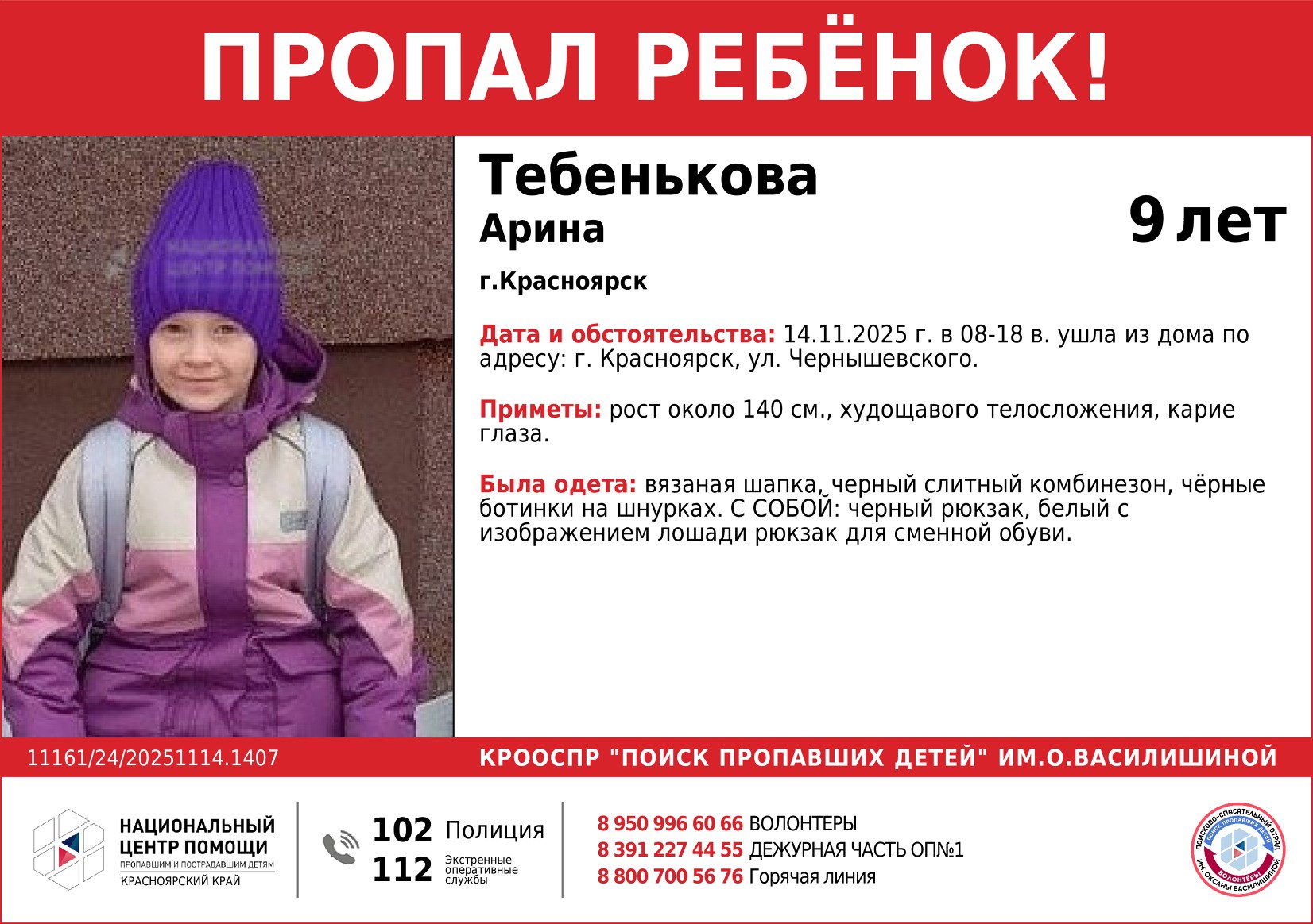 В Красноярске ищут пропавшую 9-летнюю школьницу. Сегодня, 14 ноября, утром она ушла из дома на Чернышевского и до настоящего времени не вернулась.