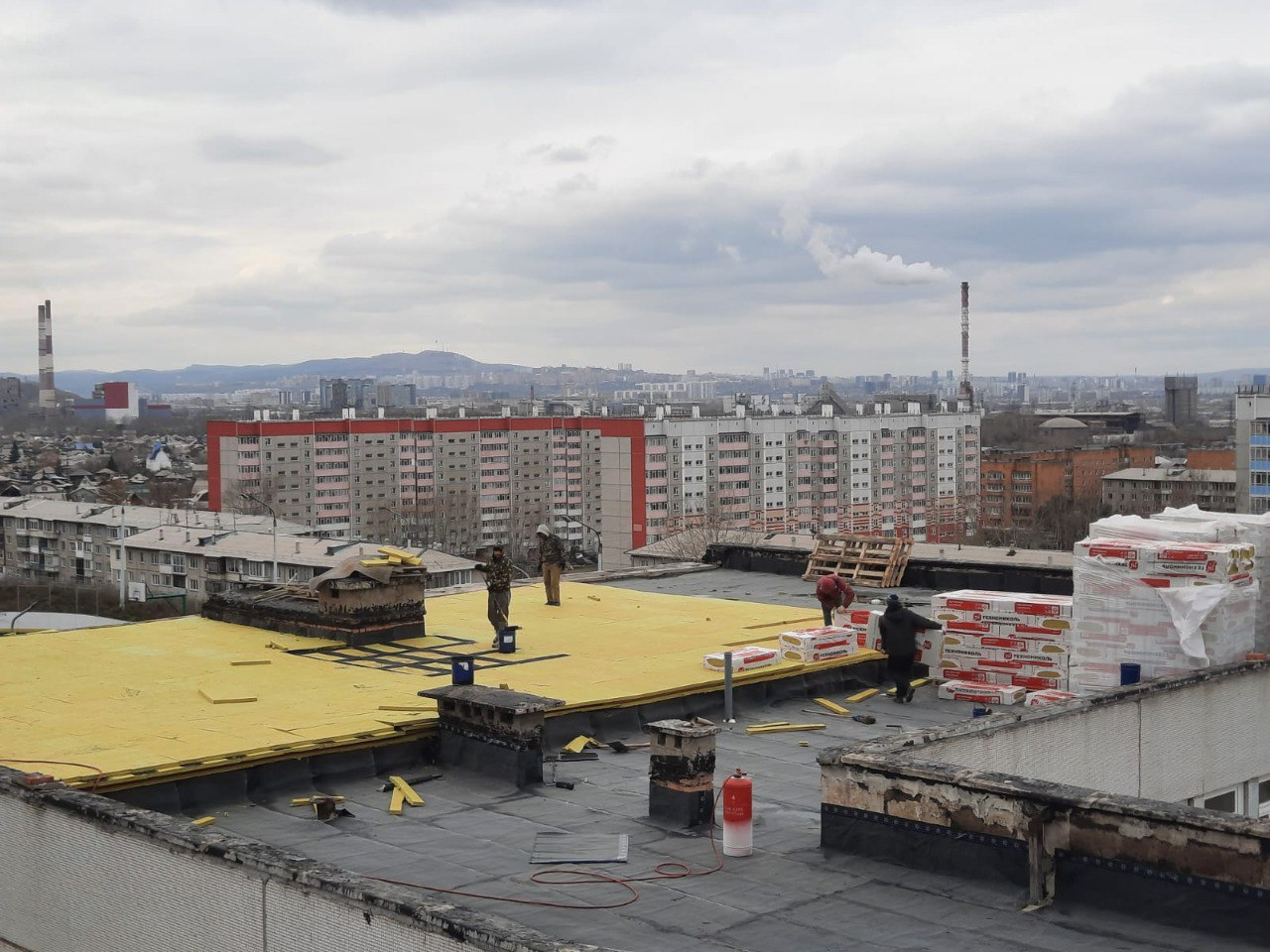 В красноярской школе № 78, на улице Алеши Тимошенкова, 82, полным ходом идет капитальный ремонт. В первую очередь строители сосредоточились ремонте крыши: уже залита новая стяжка в несколько слоев, уложены изоляционные материалы. Сейчас специалисты укладывают новую кровлю. Впереди – монтаж водостока, рассказали в городском управлении образования.
