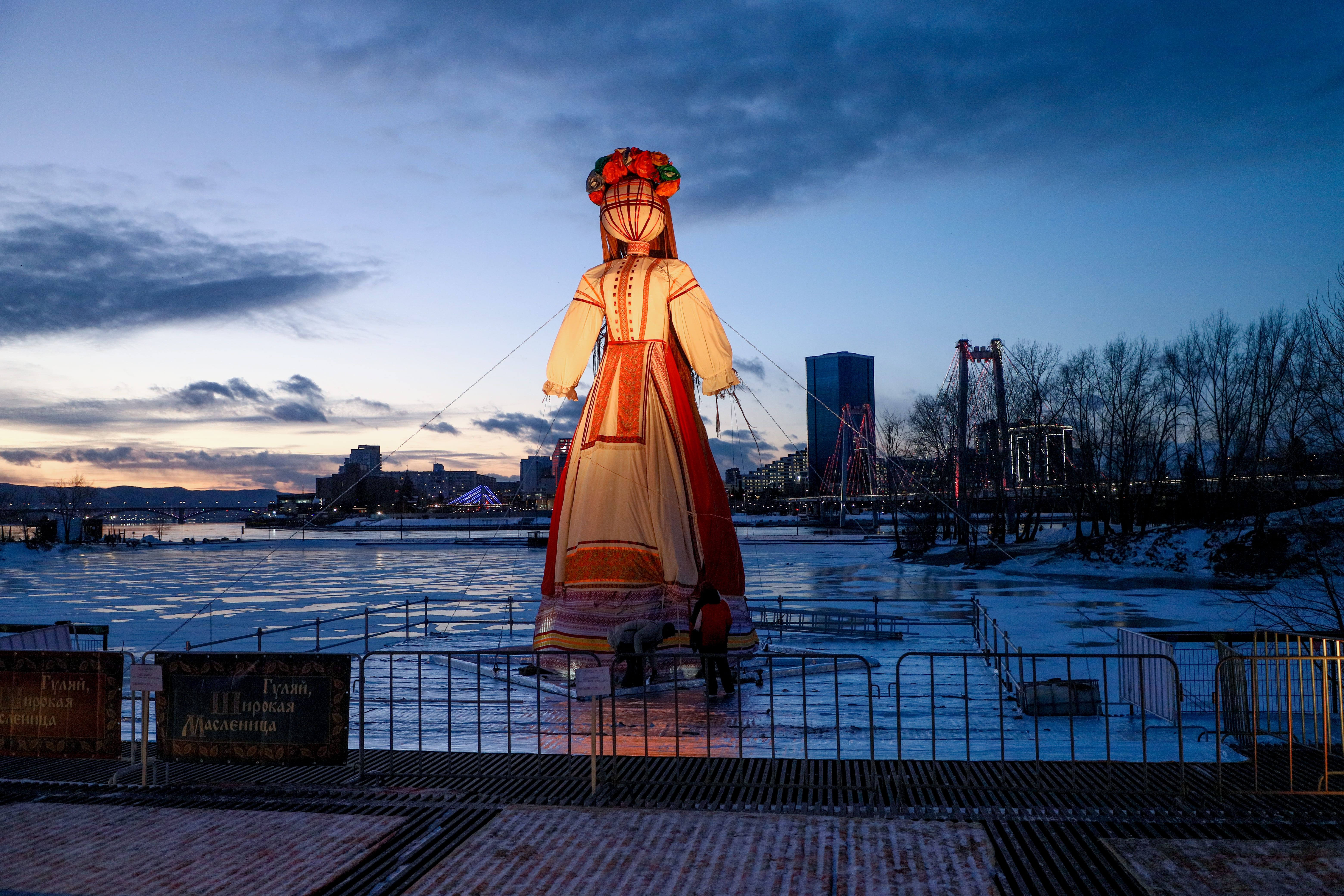 Декорации для фильма «Масленица» соорудили недалеко от Вантового моста. Как рассказал художник-постановщик фильма Иван Кузьменков, территорию выбрали из-за красивых видов Красноярска. «Здесь очень киношно», — отметил он. Главный объект — чучело Зимы — разместили как раз на фоне панорамы. Сделано оно было местными умельцами в единственном экземпляре, и чтобы оно эффектно горело на съёмках, пришлось использовать хитрости.