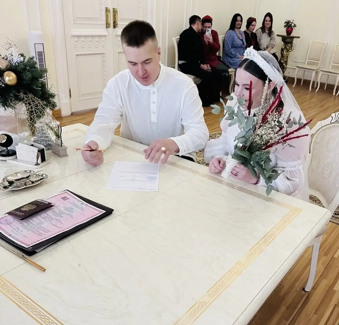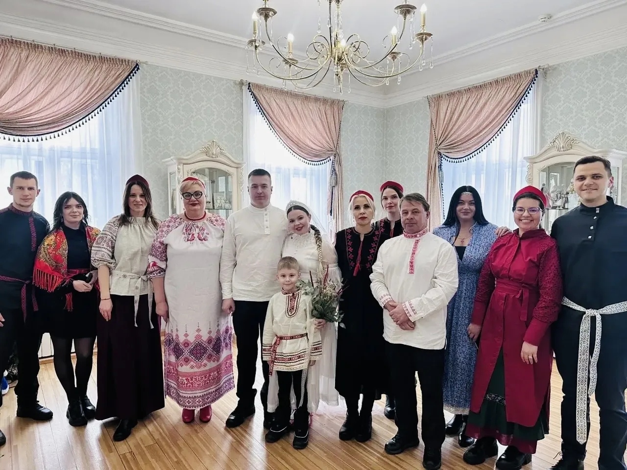2026 год объявлен годом единства народов страны, и в Доме семейных торжеств Красноярска первая пара сыграла свадьбу в русском стиле: жених пришёл в рубашке-косоворотке, невеста надела праздничный кокошник. В нарядах с народными элементами пришли и гости молодожёнов.