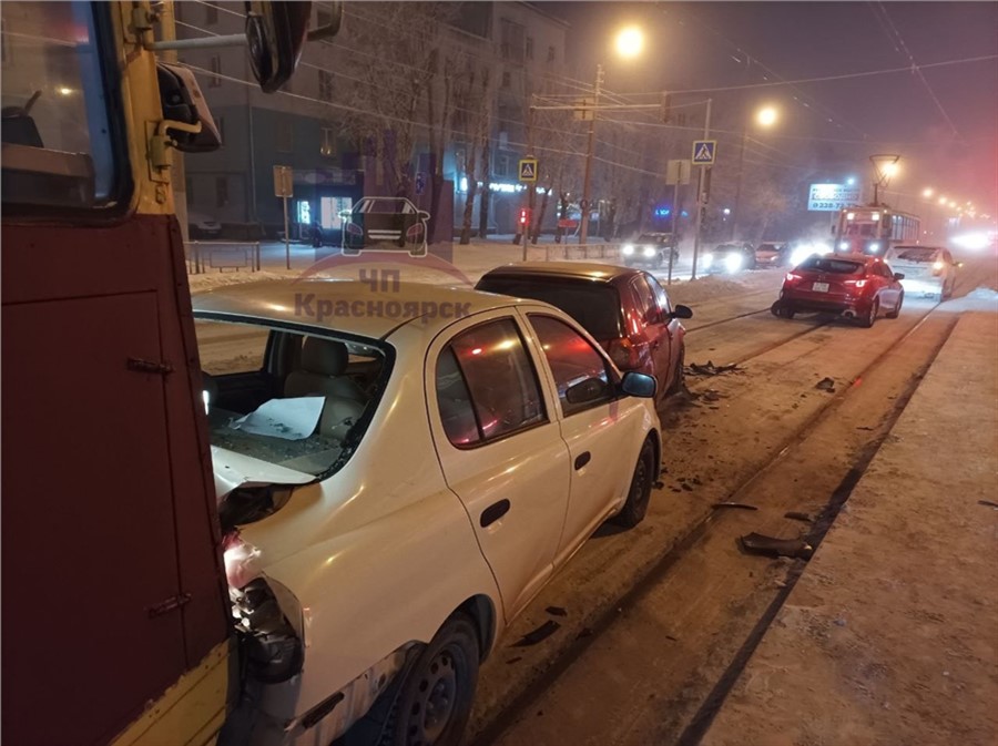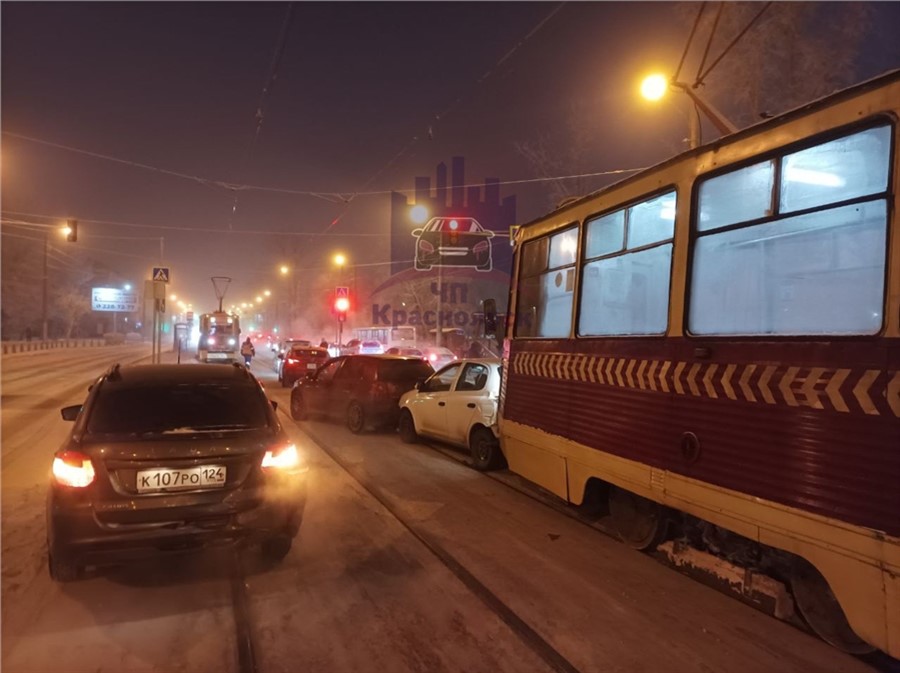 Сегодня утром в Кировском районе Красноярска произошло ДТП с участием трамвая. Общественный транспорт протаранил несколько легковых автомобилей на Мичурина.