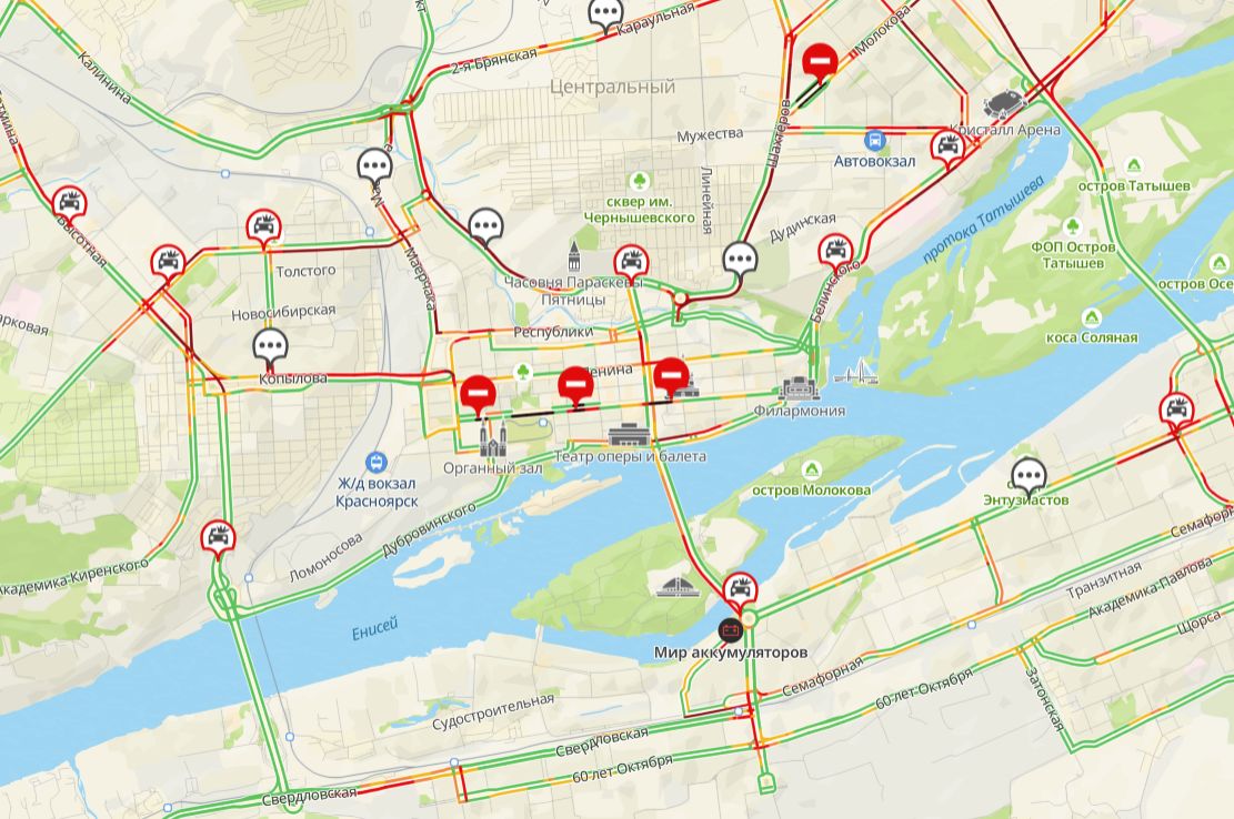 Серьезные затруднения на Копыловском мосту, Высотной, Ярыгинской набережной и улице Партизана Железняка.