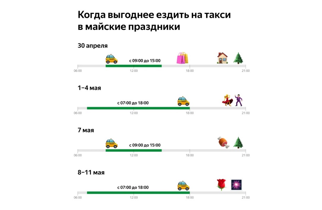 Красноярцы в основном не торопятся на работу, поэтому нет выраженного часа пик, утром и днём реже срабатывает повышающий коэффициент. Водителей хватает на все заказы, и цены становятся доступнее. Средний чек по сравнению с предпраздничными неделями падает на 10-15%.