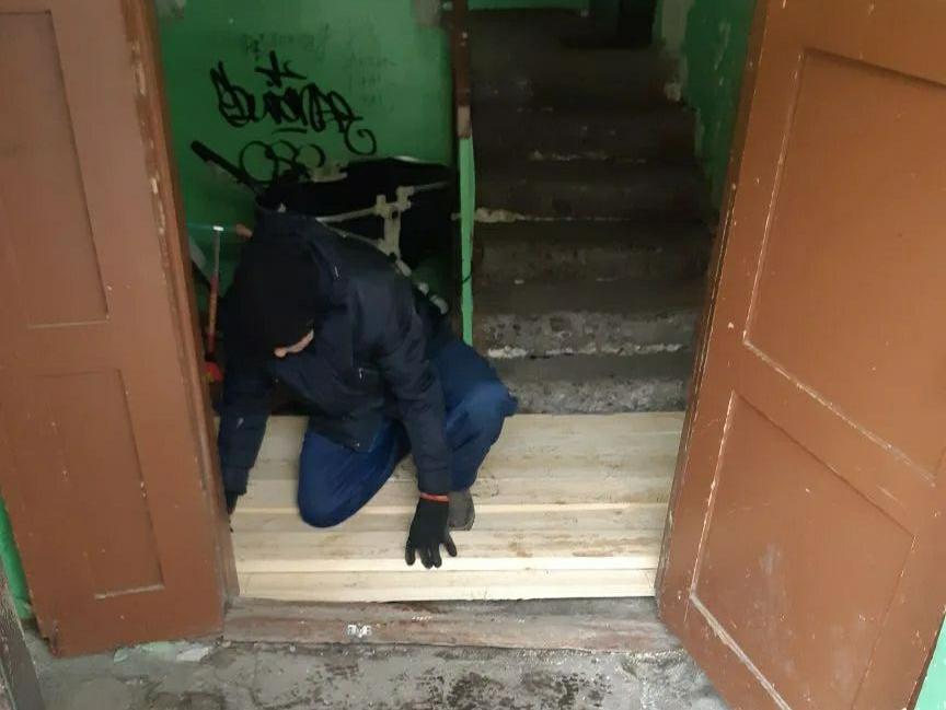 Специалисты выехали на место. В тот же день работники управляющей компании уложили деревянный настил, чтобы хоть как-то обезопасить вход в подъезд.