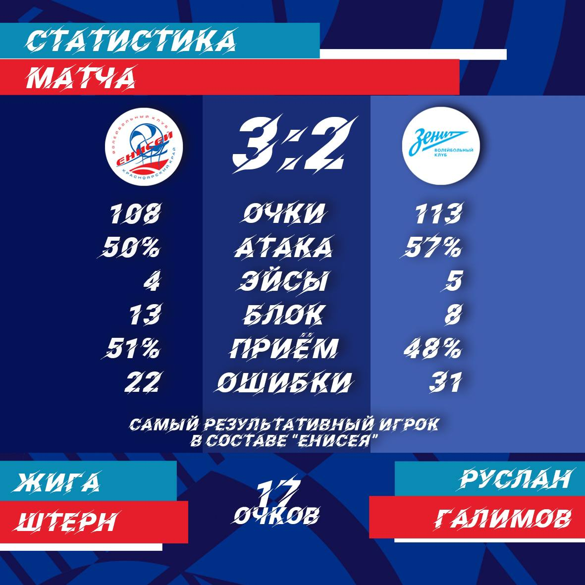 В 6 туре Суперлиги чемпионата России красноярцы обыграли серебряного призёра прошлого сезона со счётом 3:2. «Енисей» уступил в первых двух четвертях, но затем вывел петербургский «Зенит» в тай-брейк (21:25, 18:25, 25:23, 29:27, 15:13).