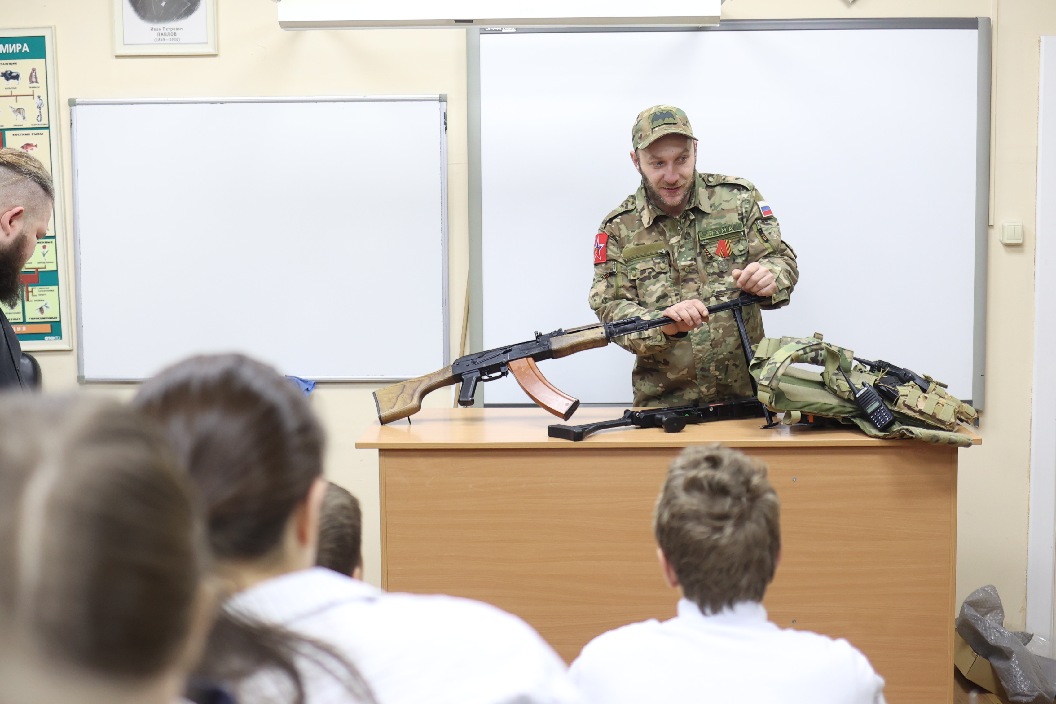На интерактивном уроке боец рассказал ученикам восьмого класса о современном стрелковом оружии и технических особенностях беспилотных летательных аппаратов (БПЛА), которые применяют наши защитники на фронте.