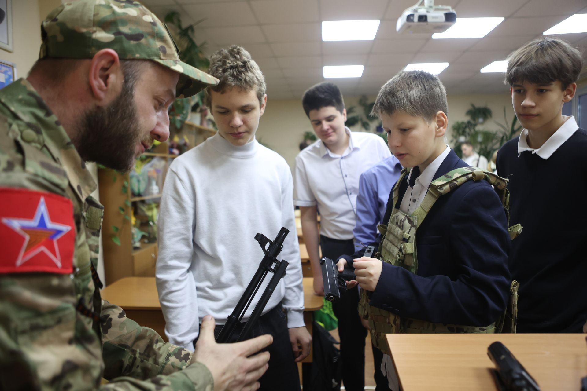 Ученики попробовали собрать и разобрать ручной пулемёт Калашникова, узнали, в чём разница между ним и автоматом, а также примерили на себя бронежилет и посчитали вес полного обмундирования военного.