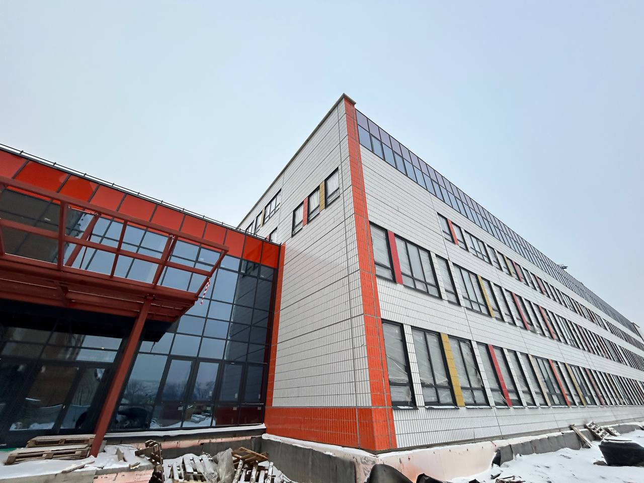 Здание почти готово снаружи, внутри идут инженерные и отделочные работы.