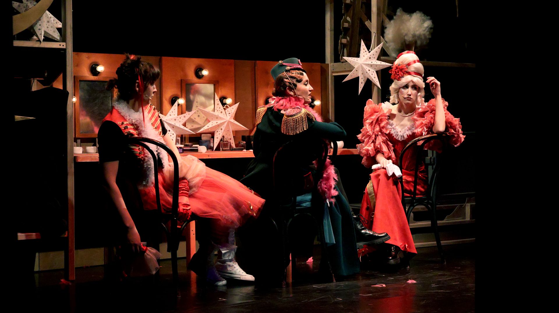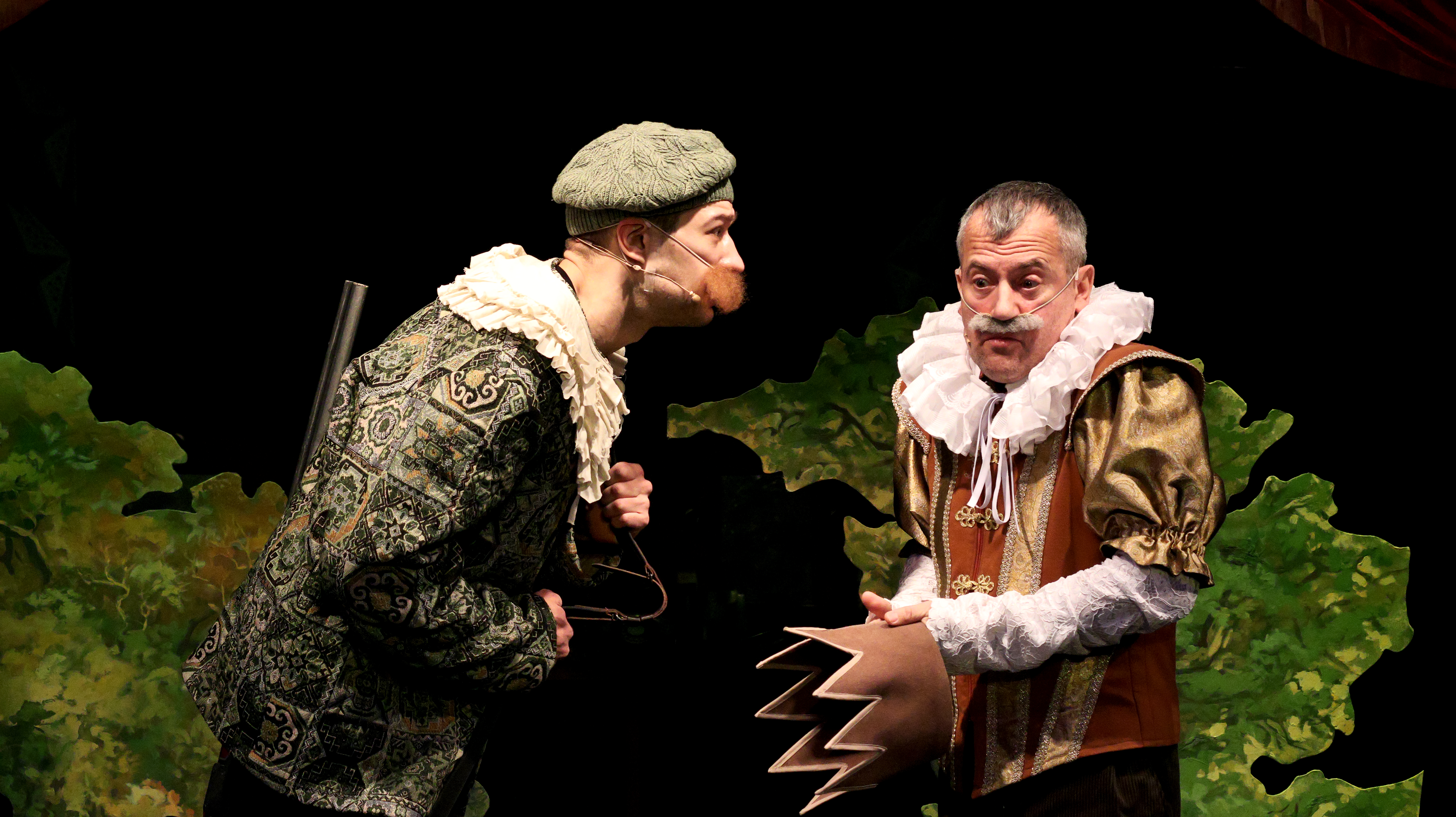 Декорации яркие, плоские, почти детские – нарочито картинные, – создают особое сказочное пространство. Замки оказываются фанерными, кареты – из папье-маше. Костюмы также отсылают к «пожившему» театру. Роли в спектакле исполняют артисты хора.