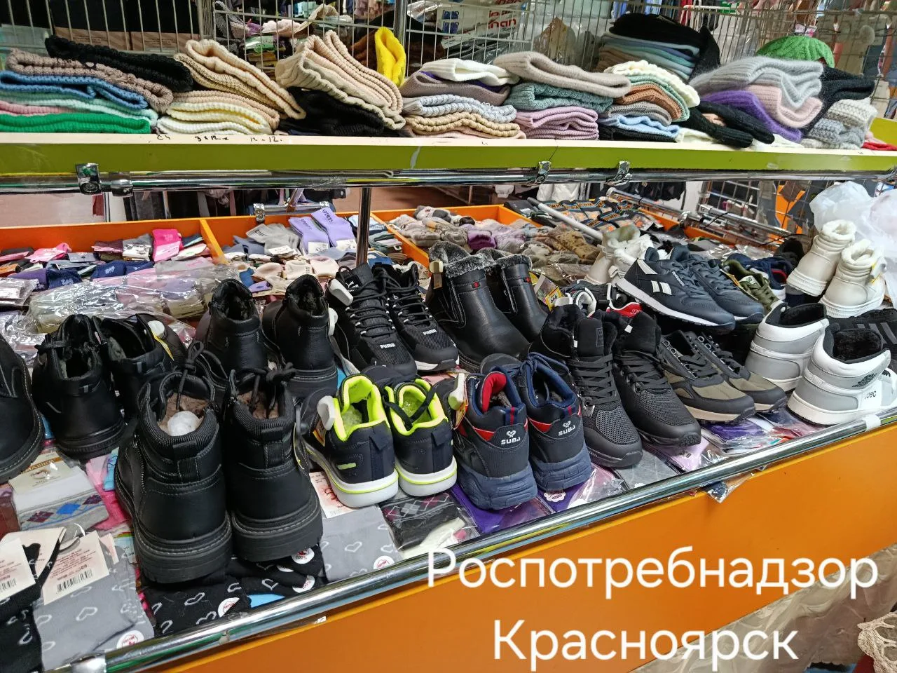 На месте нашли 20 пар обуви без обязательной маркировки. Среди них кроссовки, ботинки и детские полусапожки с логотипами известных брендов. На товаре не было штрих-кодов в формате Data Matrix, что является нарушением.