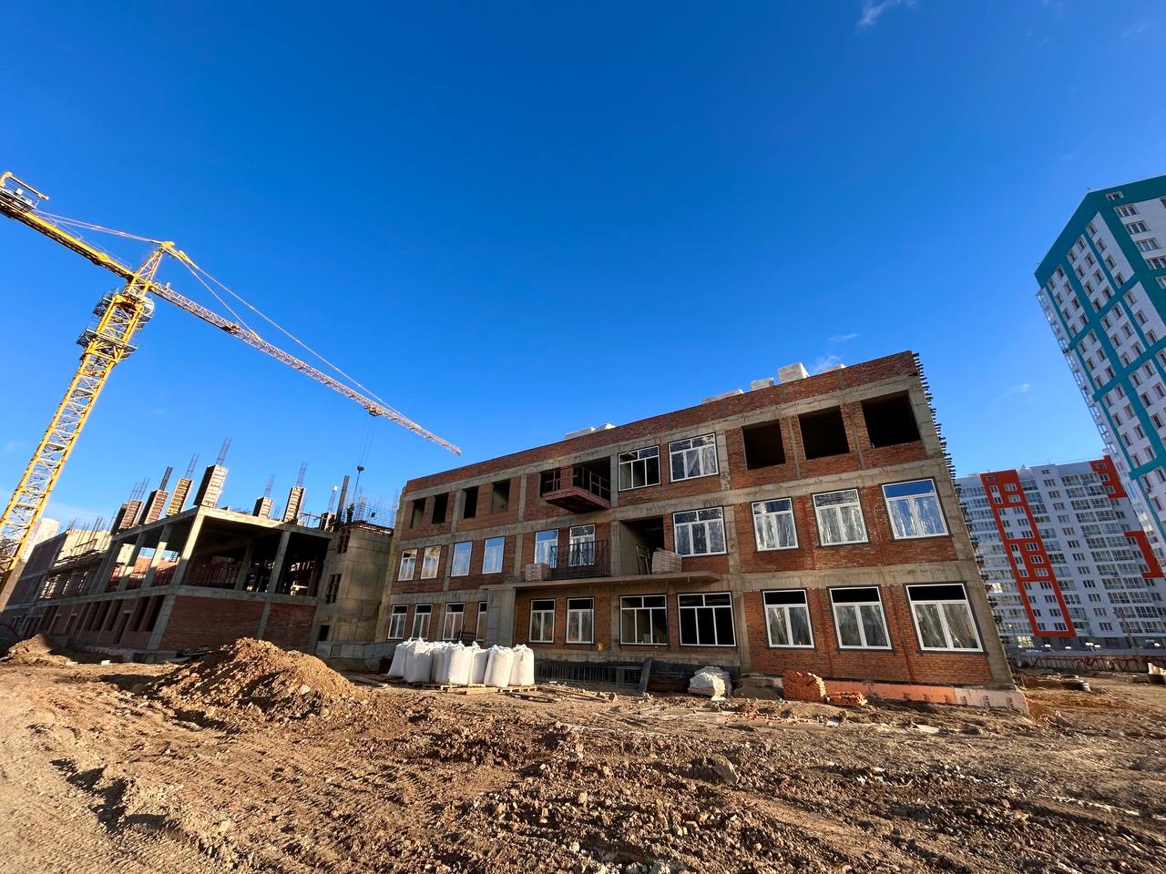 Для отделки фасадов заказали белую плитку с красными элементами. В блоке В продолжается утепление и установка окон, которую планируют завершить до конца недели. В самом крупном блоке Г, где разместятся актовый и спортивный залы, делают кирпичную кладку и монолитные работы.