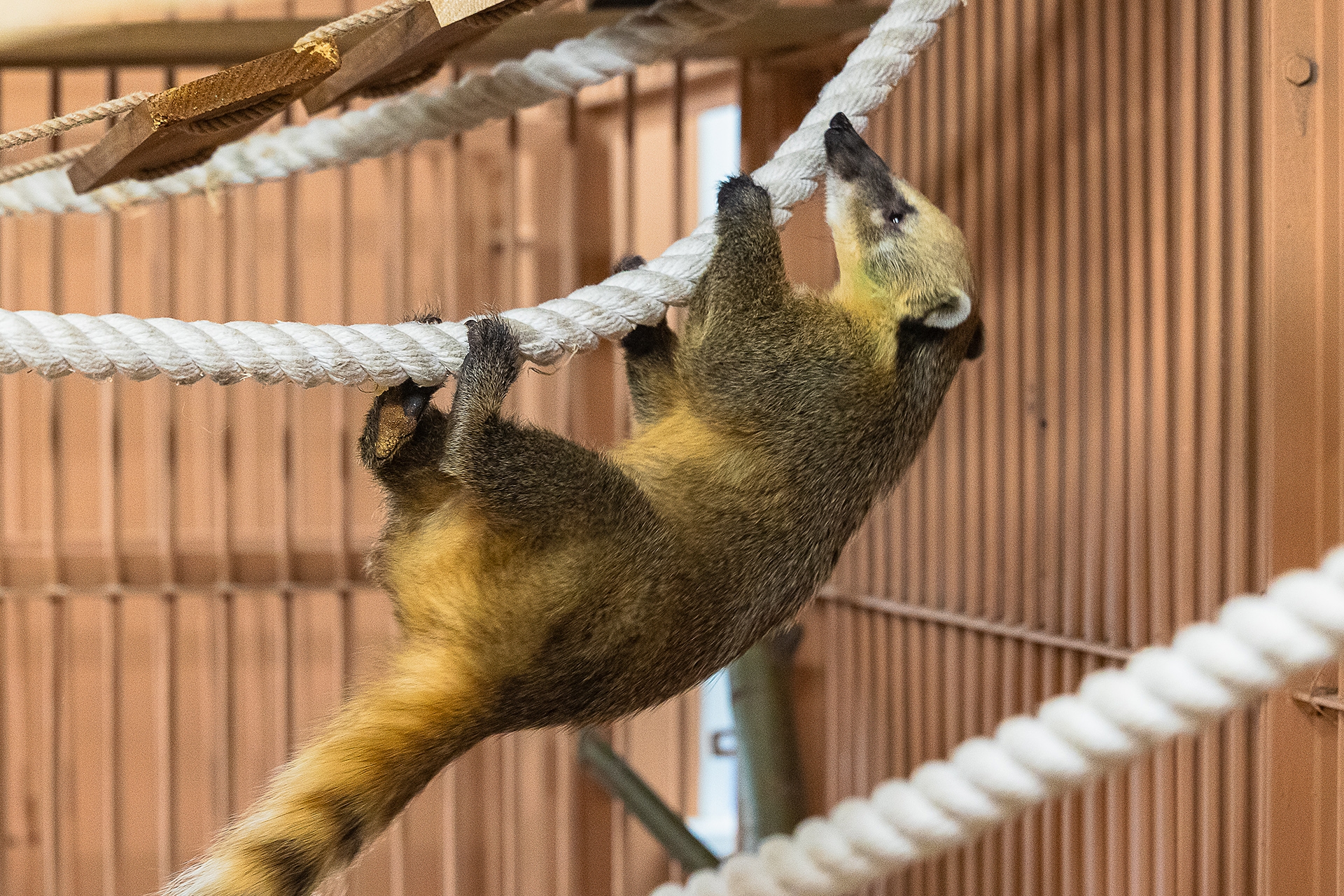 Носухи — очень интересные существа. И отличает их не только длинный нос, похожий на небольшой хобот, но и роскошный хвост. Он почти такой же длины, как само тело. Зевс и Гера ловко используют эту часть тела в повседневной жизни: она помогает балансировать, когда животные лазают по деревьям, и служит опорой, если звери встают на задние лапы — как третья нога.
