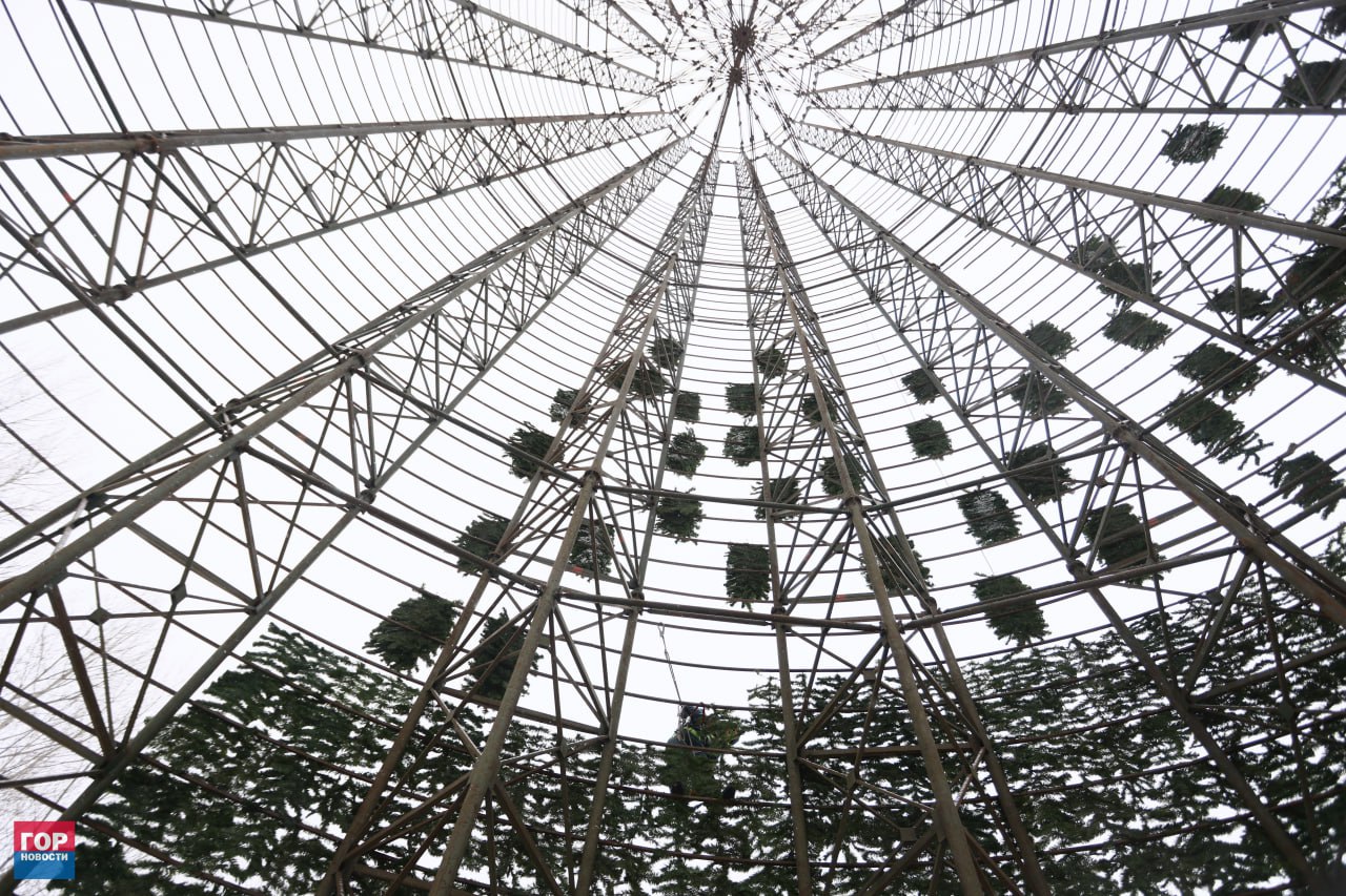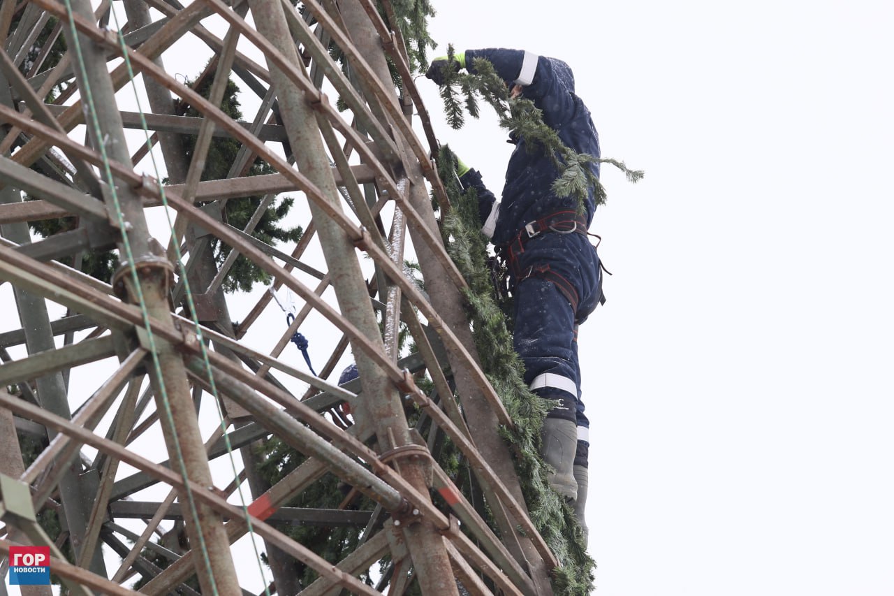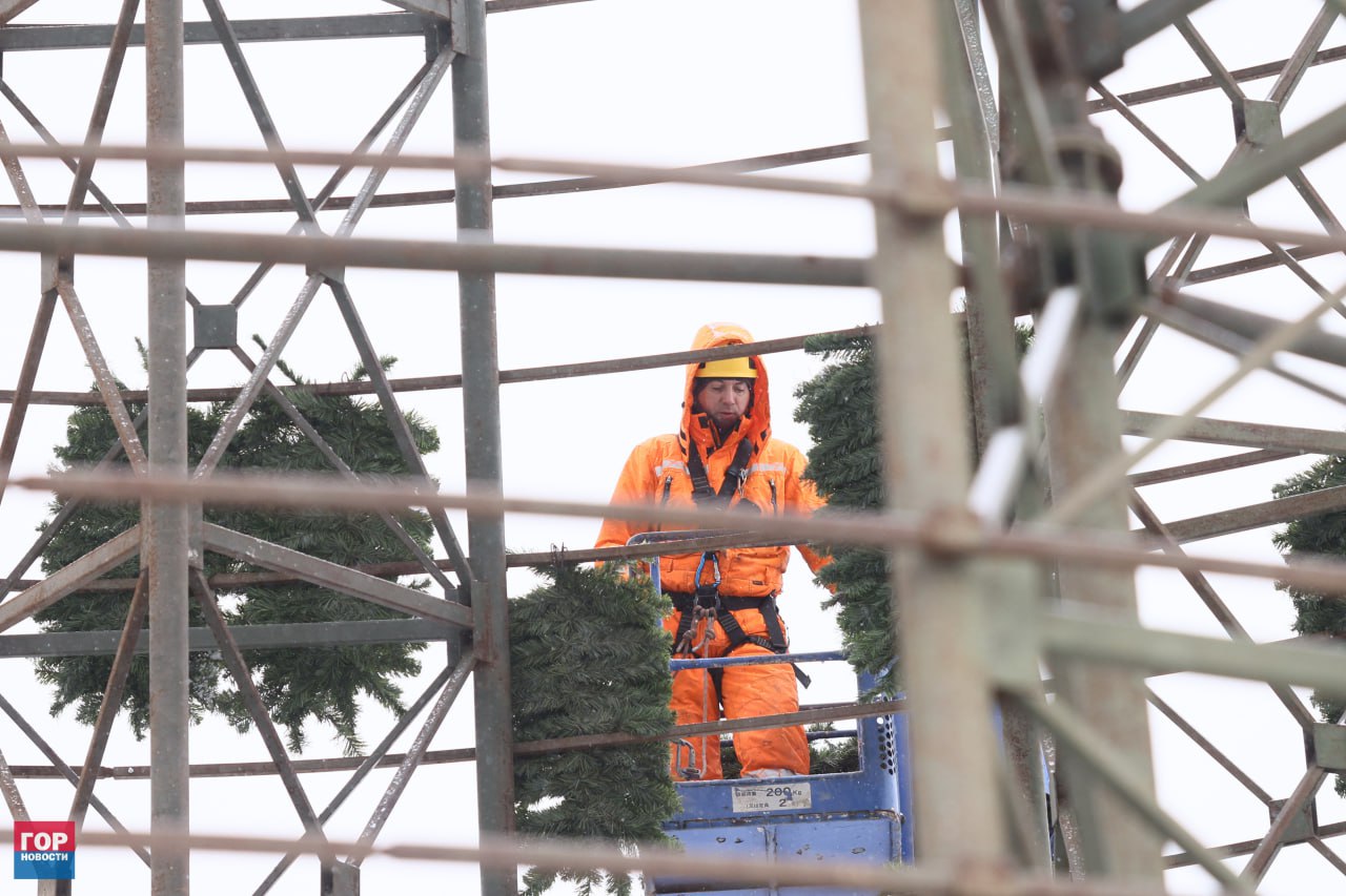 Высота конструкции — 55 метров. Ель украсят световой снежинкой на вершине и динамическими огнями. Для нее подготовят несколько эффектных световых сценариев.