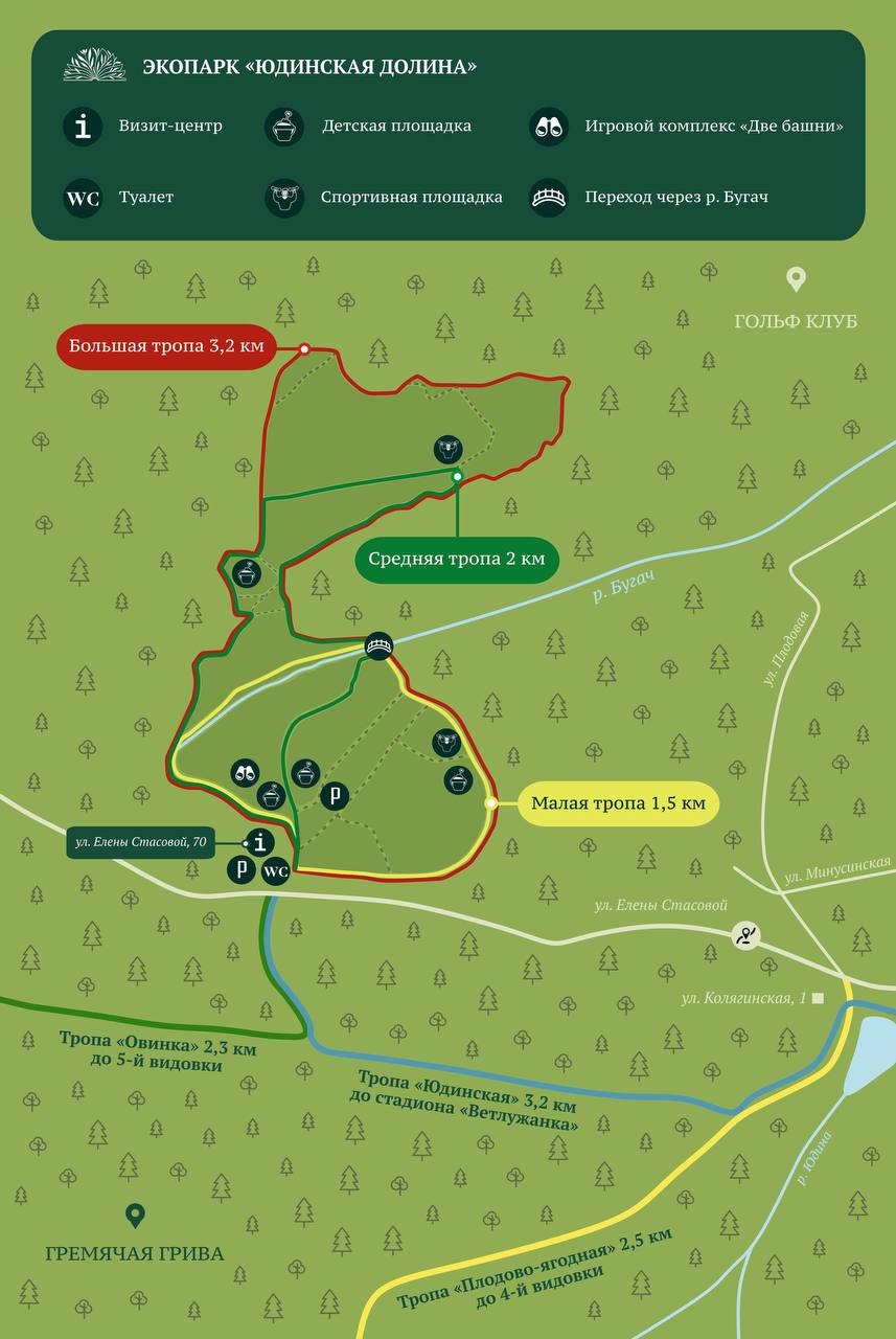 В Красноярске в экопарке Юдинская долина промаркированы три новые тропы разной протяженности: большая – 3,2 км, средняя – 2 км и малая – 1,5 км. По маршрутам можно не только гулять и тренироваться, но и дойти до оборудованных пикниковых зон посреди леса.