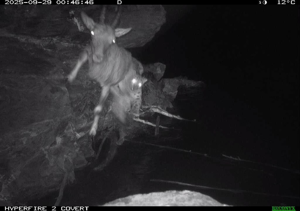 В заповеднике на юге Красноярского края сняли редкие кадры ночной охоты ирбиса на козерога