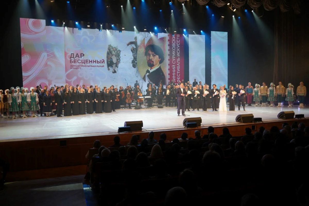 В Красноярской филармонии состоялось торжественное закрытие XX Зимнего суриковского фестиваля искусств. Финальным аккордом юбилейного сезона стал масштабный литературно-музыкальный спектакль «Дар бесценный», посвященный жизни великого сибирского художника Василия Сурикова.