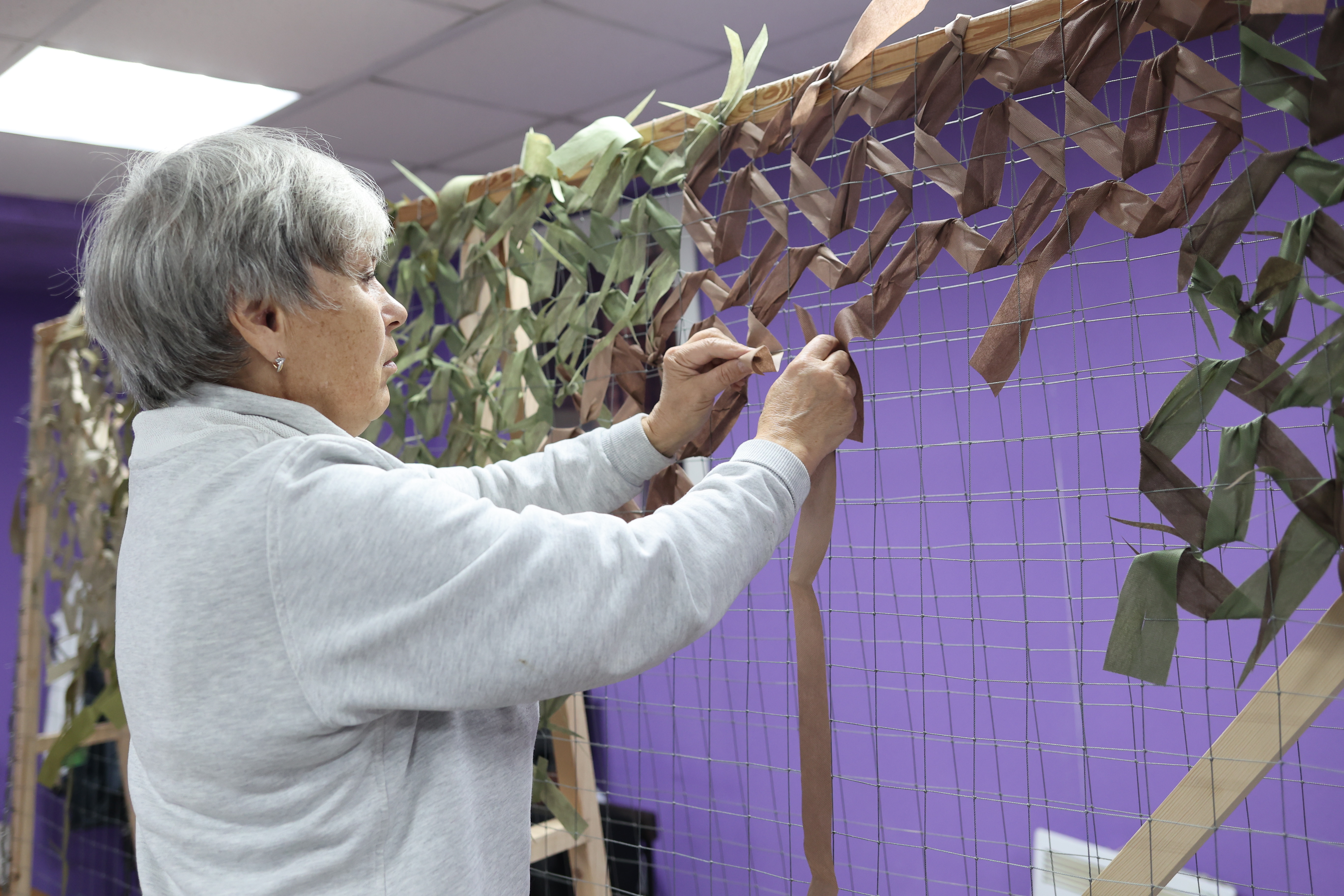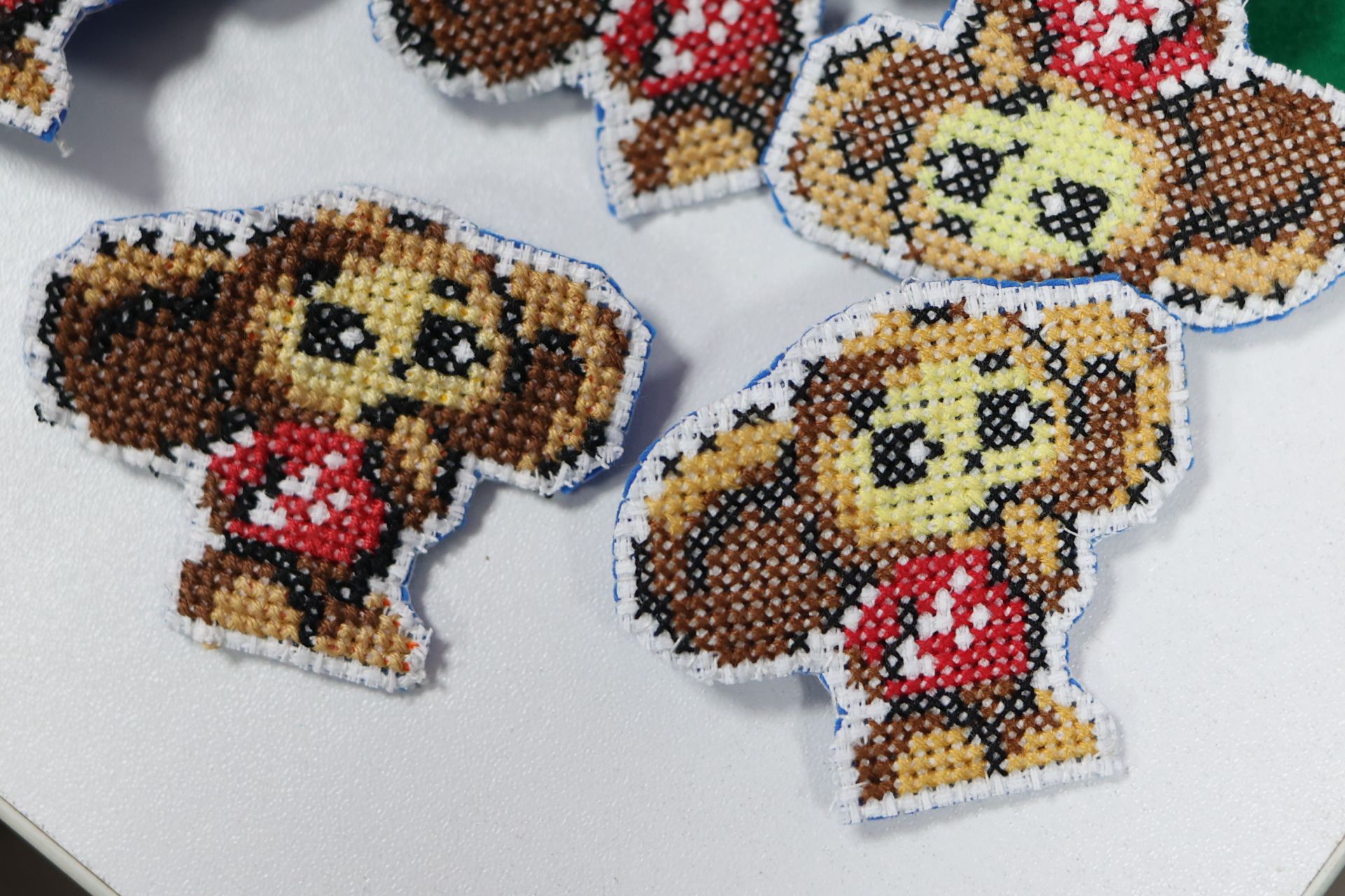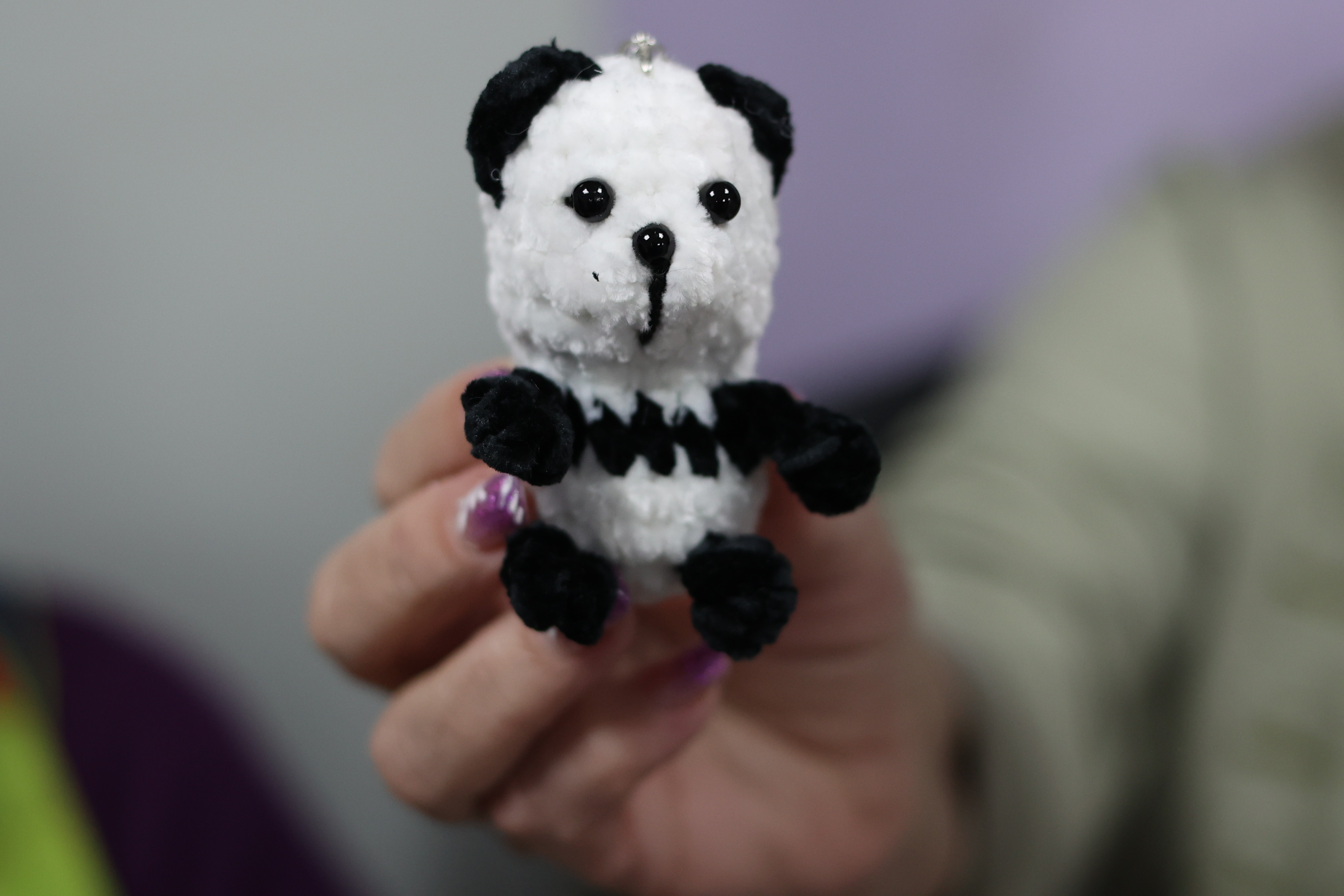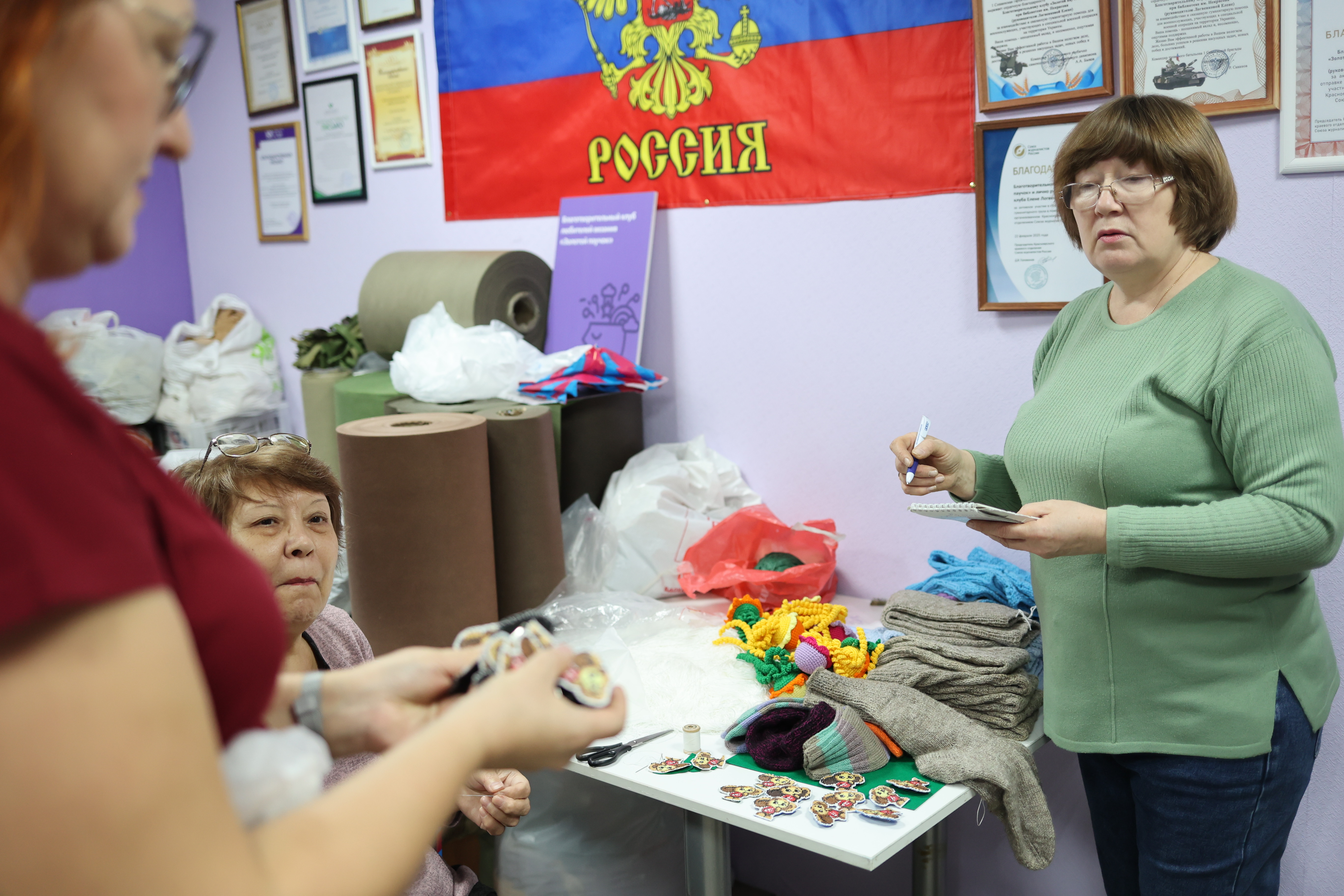 Клуб “Золотой паучок” практически с начала СВО помогает бойцам — волонтёры вяжут для них тёплую одежду, плетут маскировочные сети. К этой важной работе подключились и подопечные ПНИ — они уже несколько лет вяжут для военнослужащих тёплые носки. А однажды жительница интерната Вера Петелина спросила: “Можно я картину вышью солдату?” После обсуждения с психологом учреждения родилась идея создавать не картины, а маленькие вышитые значки-обереги. Волонтёры нашли простые схемы для вышивки крестиком, и работа закипела. Вера и Настя Бубнович вышивают чебурашек и передают в клуб.