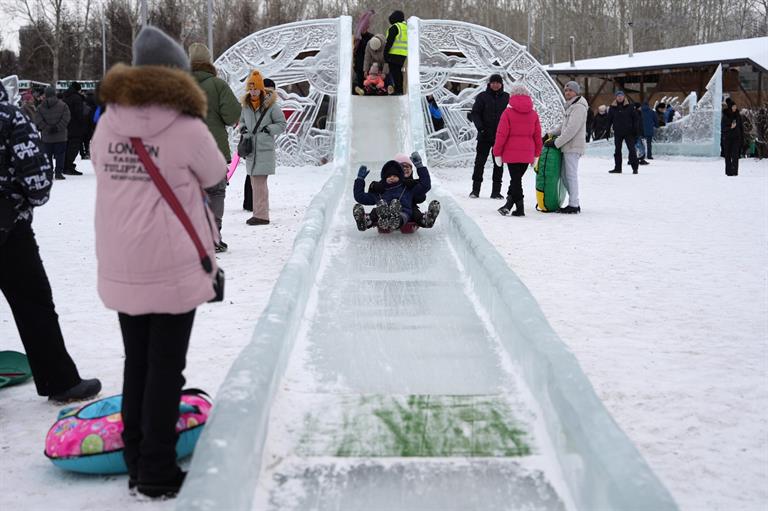 В этом году для зимних забав подготовили пять горок: три большие, высотой более трёх метров и две средних размеров. Для самых маленьких посетителей организаторы предусмотрели отдельную локацию с небольшими ледовыми спусками, которые будут включены в угловые ледовые композиции, а также аттракцион Чашу.