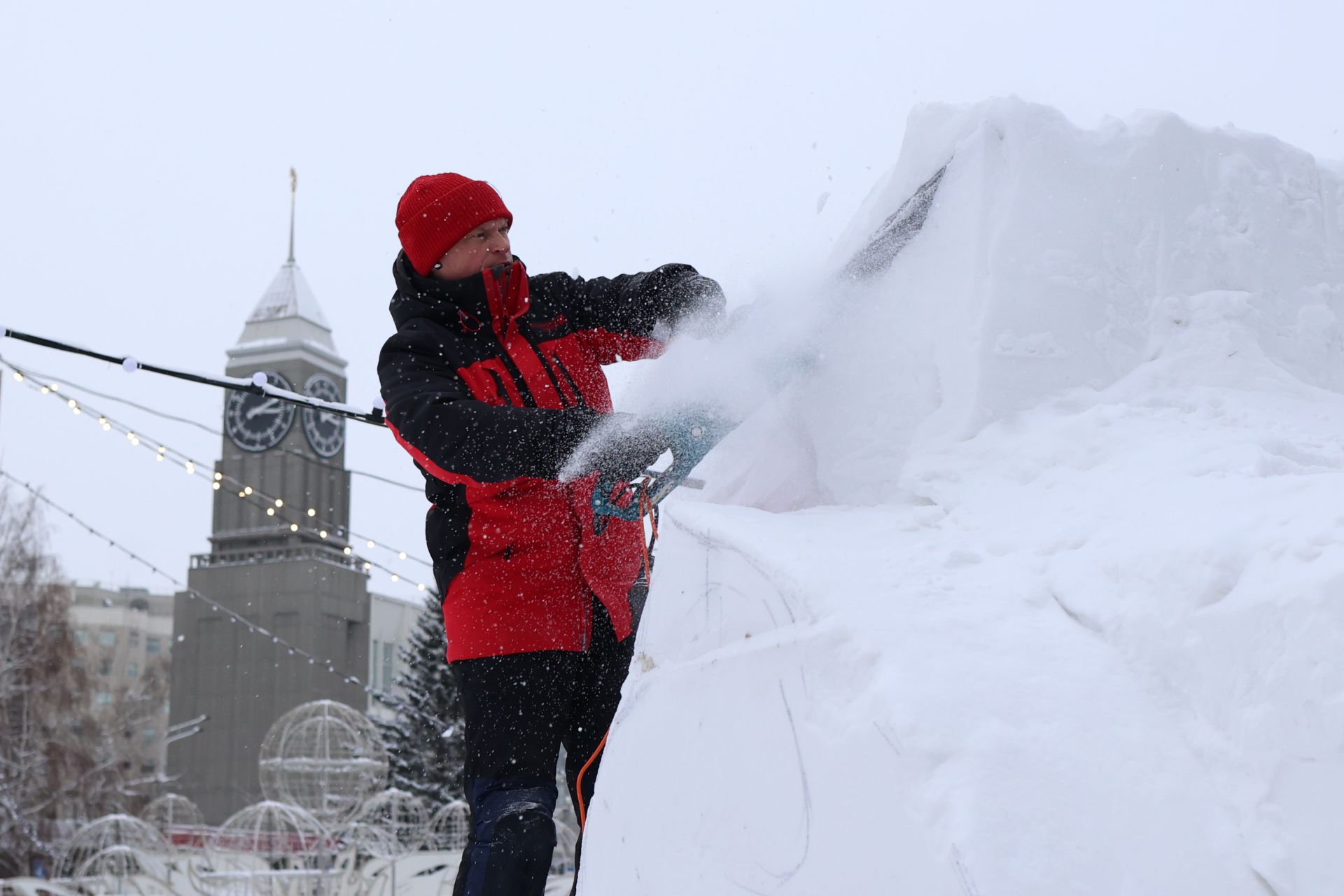 Под звук бензопил и скребков из снежных глыб, размещённых на Театральной площади, начинают проступать очертания будущих снежных скульптур. Мастера из разных регионов России второй день трудятся над созданием изваяний для фестиваля «Волшебный лёд Сибири».