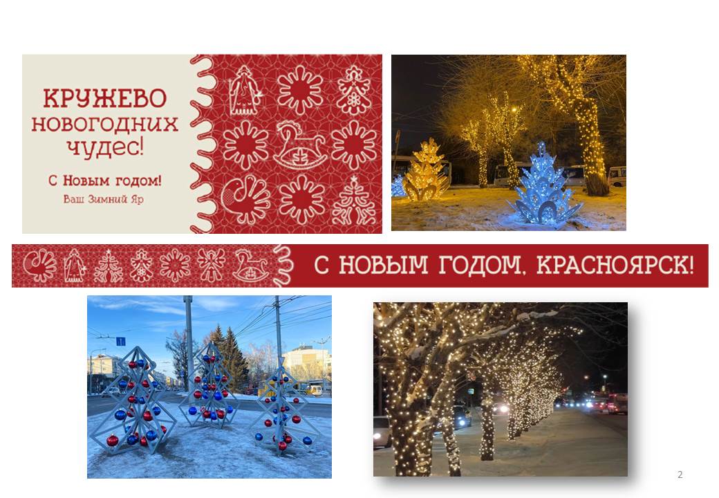 В центре города уже монтируют новогоднюю иллюминацию. Новые световые объекты — около 180 спиралей — украсят въезд с ул. Дубровинского на Николаевский проспект и съезд в районе ул. Годенко.— Красноярцев ждут продолжительные новогодние выходные – более 10 дней. Город должен дать возможность жителям провести каникулы интересно и активно, но при этом нужно не забывать о комплексных вопросах безопасности, составить планы и графики работы сотрудников жилищно-коммунального хозяйства и транспорта в выходные дни, — отметил временно исполняющий полномочия главы города Роман Одинцов. — Атмосфера праздника должна создаваться не только силами города, но и предпринимателями – необходимо украсить входные группы и прилегающие территории. Благодарим бизнес, который уже включился в создание особого настроения.